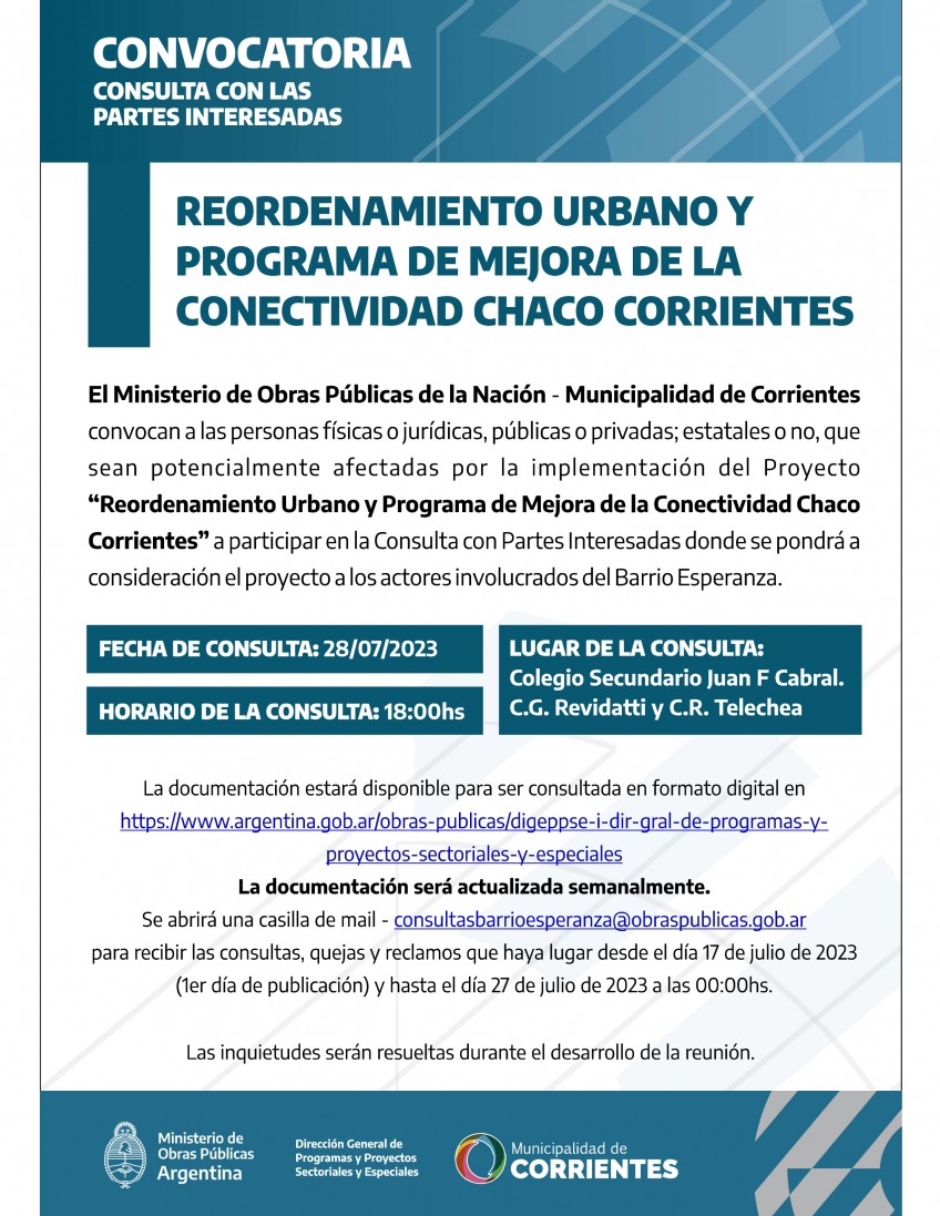 El Ministerio de Obras Públicas de la Nación y la Municipalidad de Corrientes, convocan a las personas físicas o jurídicas, públicas o privadas; estatales o no, que sean potencialmente afectadas por la implementación del Proyecto “Reordenamiento Urbano y Programa de Mejora de la Conectividad Chaco Corrientes" a participar en la Consulta con Partes Interesadas donde se pondrá a consideración el proyecto a los actores involucrados del Barrio Esperanza.