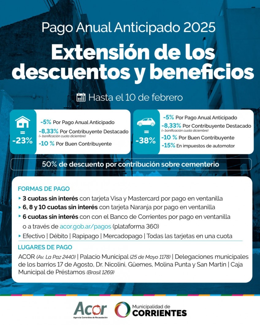 La Municipalidad de Corrientes extenderá hasta el 10 de febrero los beneficios por adherir al Pago Anual Anticipado 2025, ofreciendo a los contribuyentes la posibilidad de acceder a importantes reducciones en sus tributos.