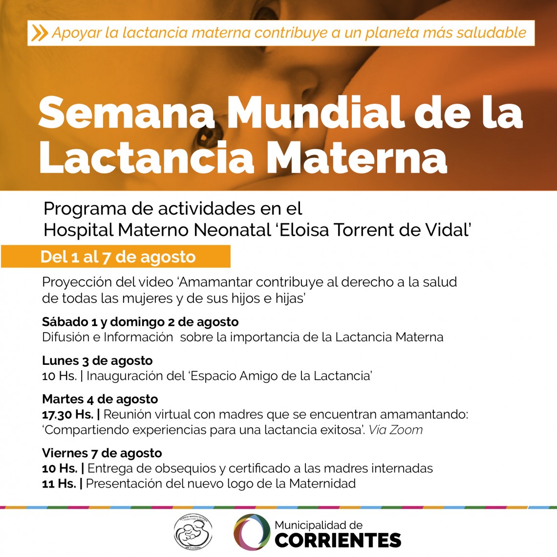 El Hospital Materno Neonatal Eloisa Torrent de Vidal realizará diversas actividades por la semana mundial de la lactancia materna con el apoyo de la Municipalidad.
