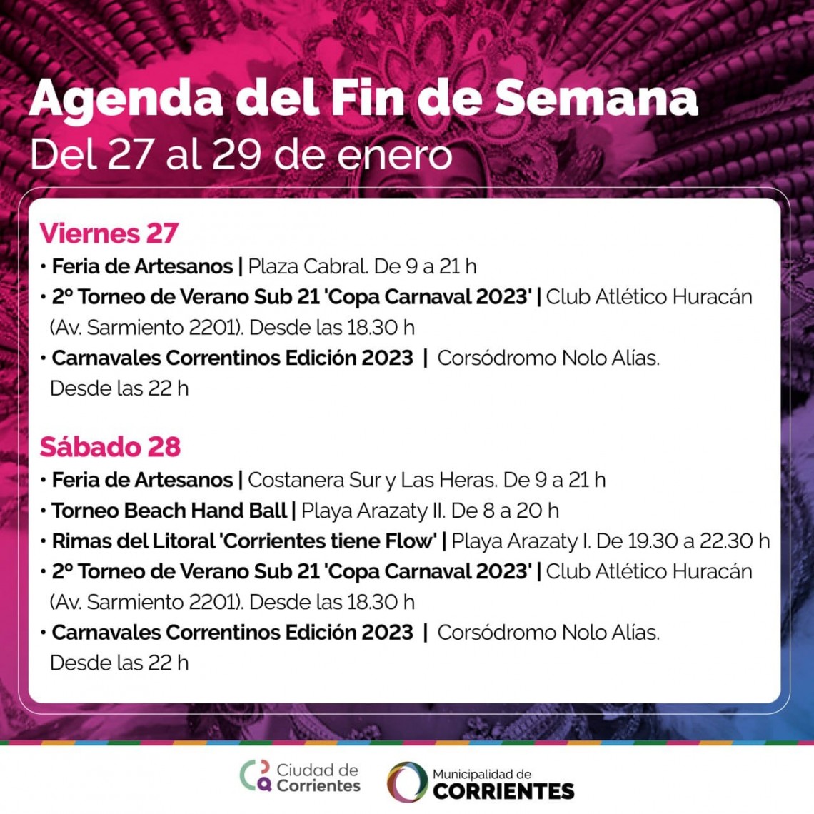 Carnavales, ferias, música urbana, deporte y playas son las propuestas que la Municipalidad de Corrientes preparó para que vecinos de la ciudad de Corrientes y visitantes disfruten a lo largo de todo el fin de semana.