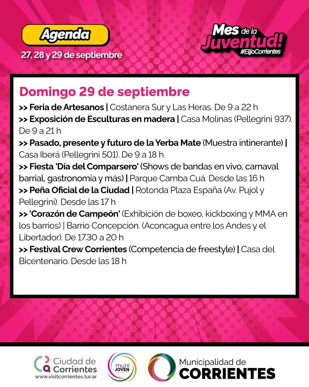 La Municipalidad de Corrientes programó actividades que se desarrollarán de viernes a domingo en distintos espacios al aire libre de la ciudad. Están previstas alternativas deportivas, musicales, la clásica Peña de la Ciudad, una celebración dedicada a los comparseros y un festival con competencias de freestyle.