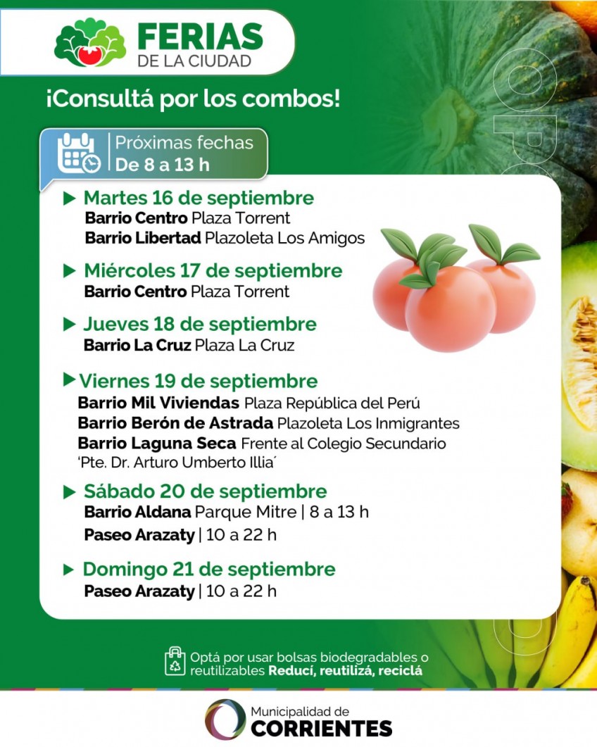 Entre el martes 16 y el domingo 21 de septiembre, las ferias itinerantes organizadas por la Municipalidad volverán a realizar su habitual recorrido por los barrios de Corrientes con su oferta de productos de calidad y mejores precios. Los vecinos podrán adquirir frutas y verduras, productos manufacturados, artesanías, plantas ornamentales, entre otras propuestas.