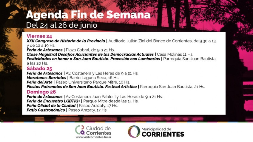 Múltiples actividades culturales, recreativas y religiosas forman parte de las propuestas que prepara la Municipalidad de Corrientes para que vecinos y turistas disfruten este fin de semana en la ciudad. En esta nota conocé en detalle los días y horarios de las variadas alternativas para recrearte y vivir a pleno la capital del Taragüí.