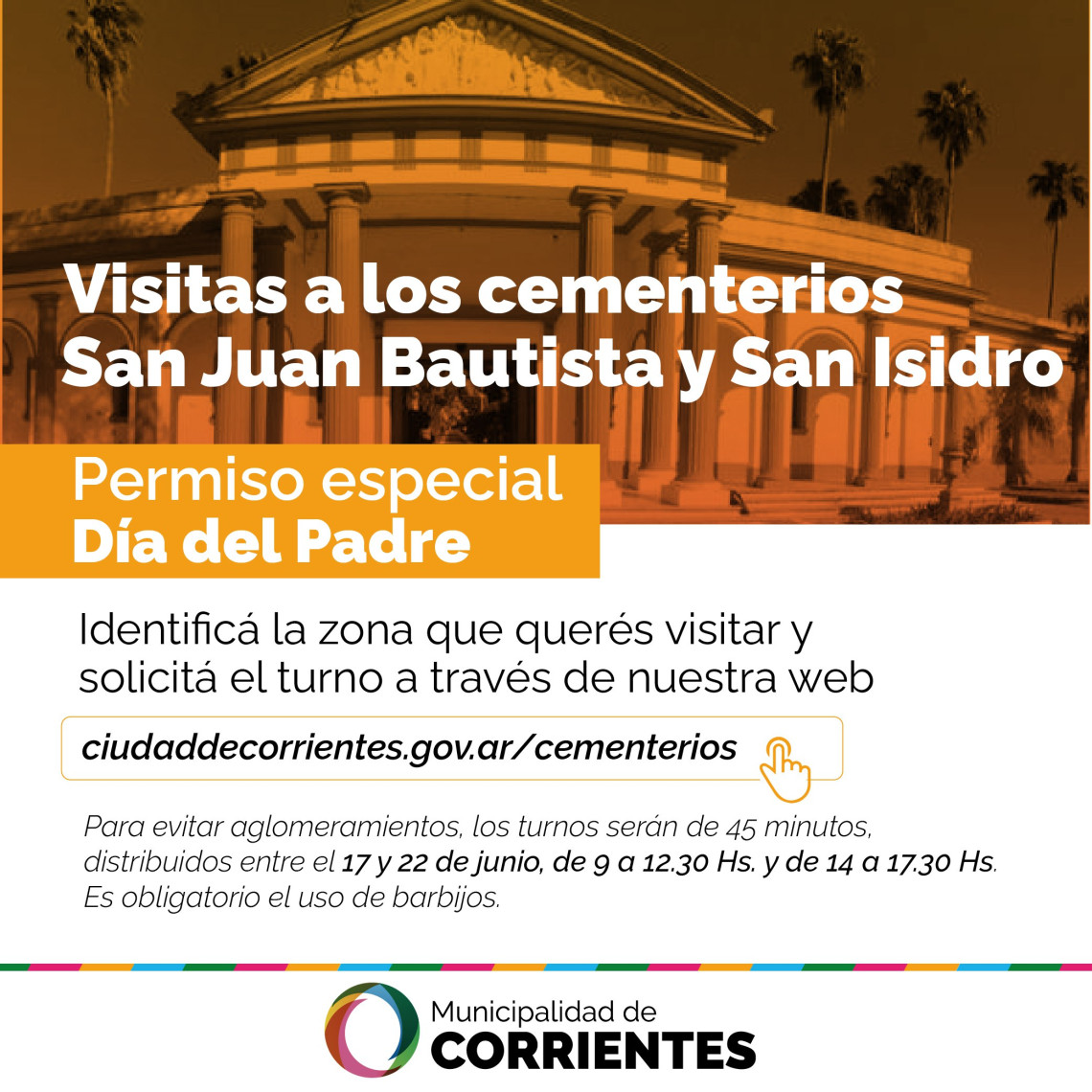 De cara al Día del padre, que se conmemora el próximo domingo 20 de junio, desde el jueves 17 al martes 22 de junio, la Municipalidad de la ciudad de Corrientes organizará un sistema de turnos para quienes deseen visitar a sus deudos en los cementerios San Juan Bautista y San Isidro.