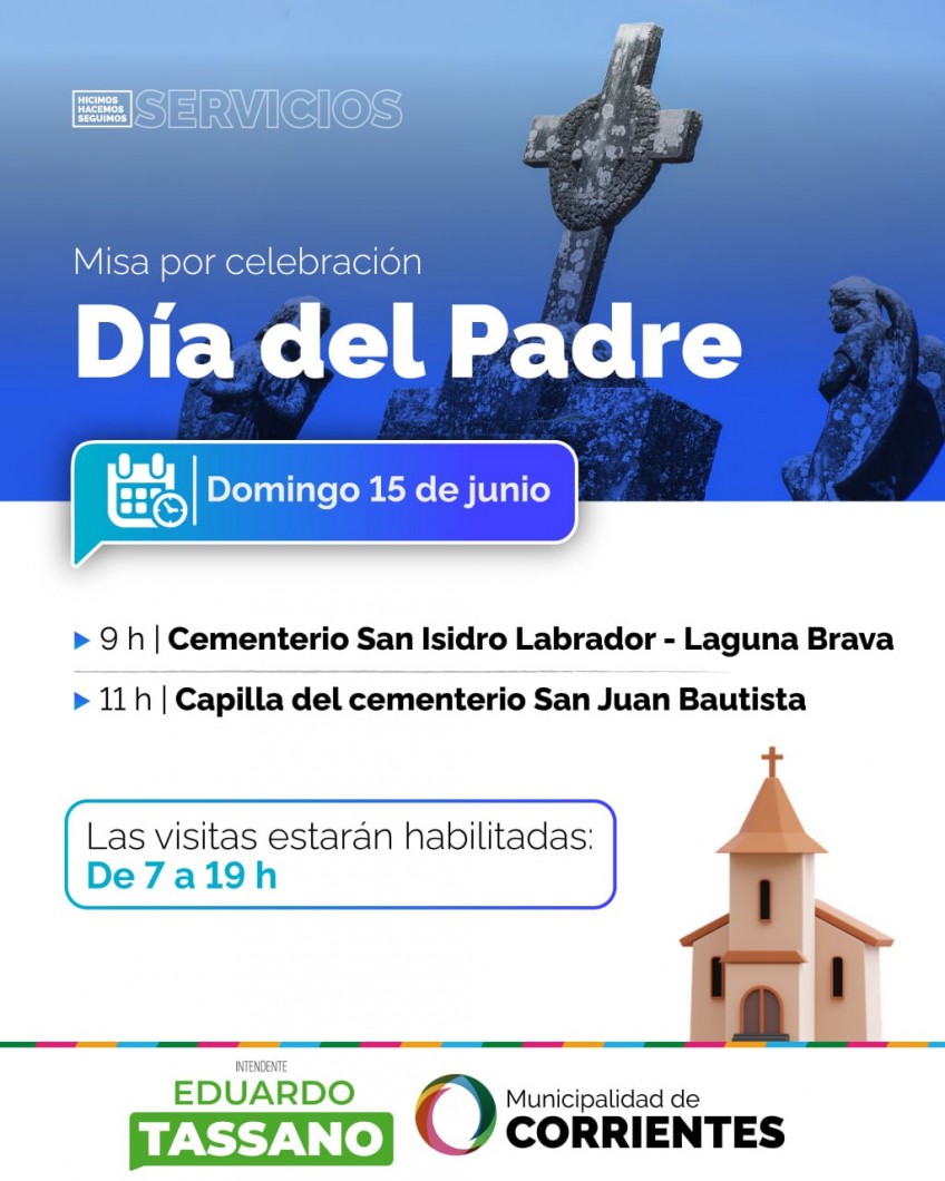 La Municipalidad de Corrientes informa el funcionamiento de los cementerios San Juan Bautista, del barrio Virgen de los Dolores, y San Isidro Labrador de Laguna Brava, por conmemorarse el domingo el Día del Padre. El horario de visitas durante el sábado y domingo será de 7 a 19.