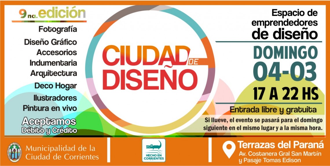 Diseñadores locales junto al Municipio Capitalino realizarán la novena edición de "Ciudad de Diseño", el próximo domingo 4 de marzo. Con entrada libre y gratuita, los vecinos de la ciudad y turistas podrán recorrer el espacio de venta de emprendedores del diseño. El nuevo horario de esta actividad será de 17 a 22 horas, y se realizará en las Terrazas del Paraná (Costanera Norte).