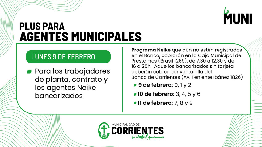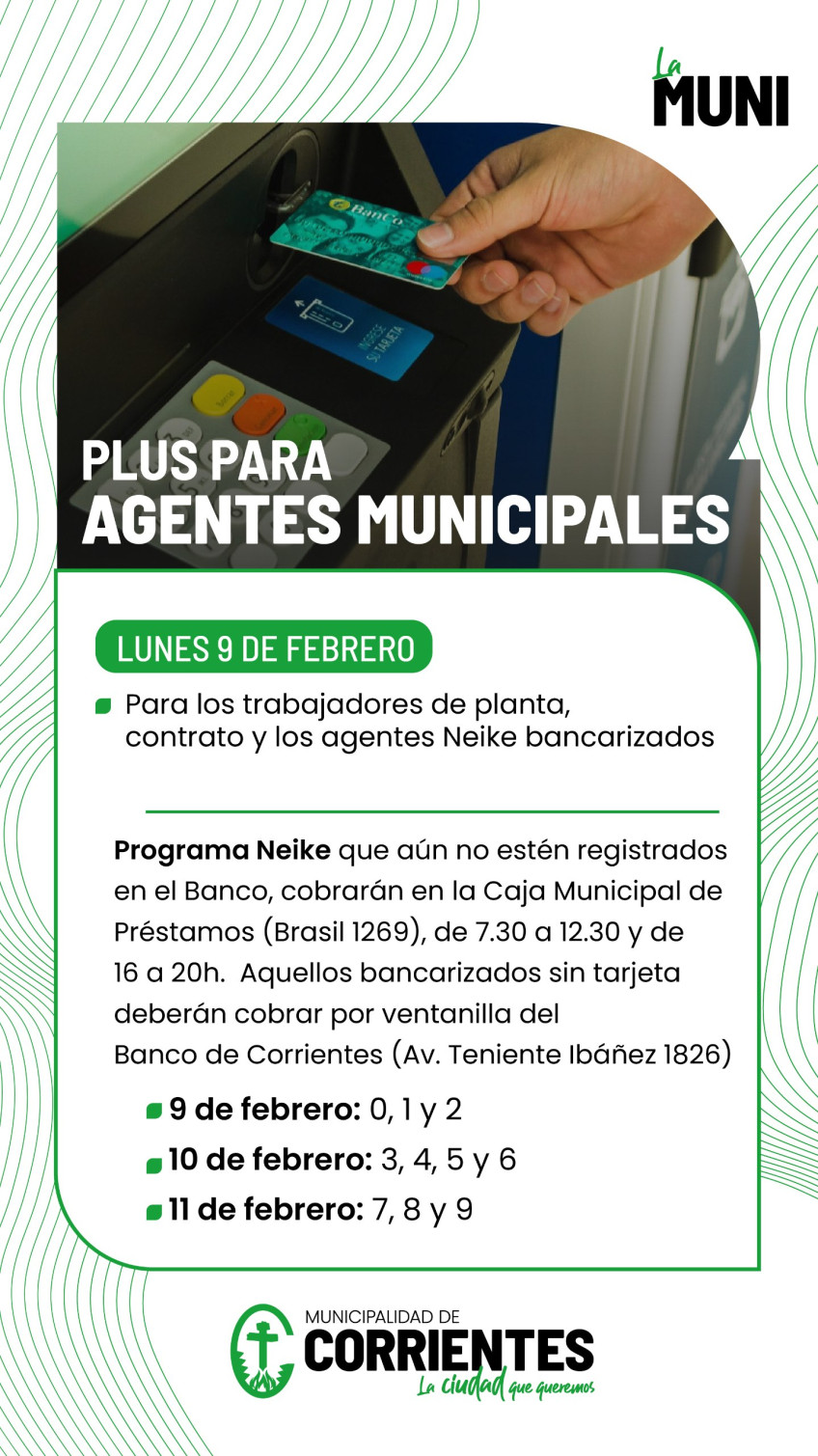 La Municipalidad de Corrientes anuncia que los trabajadores de planta, contrato y los agentes Neike bancarizados tendrán depositado el primer plus salarial de febrero en sus respectivas cuentas el próximo lunes 9, dinero al que podrán acceder a través de los cajeros automáticos.
