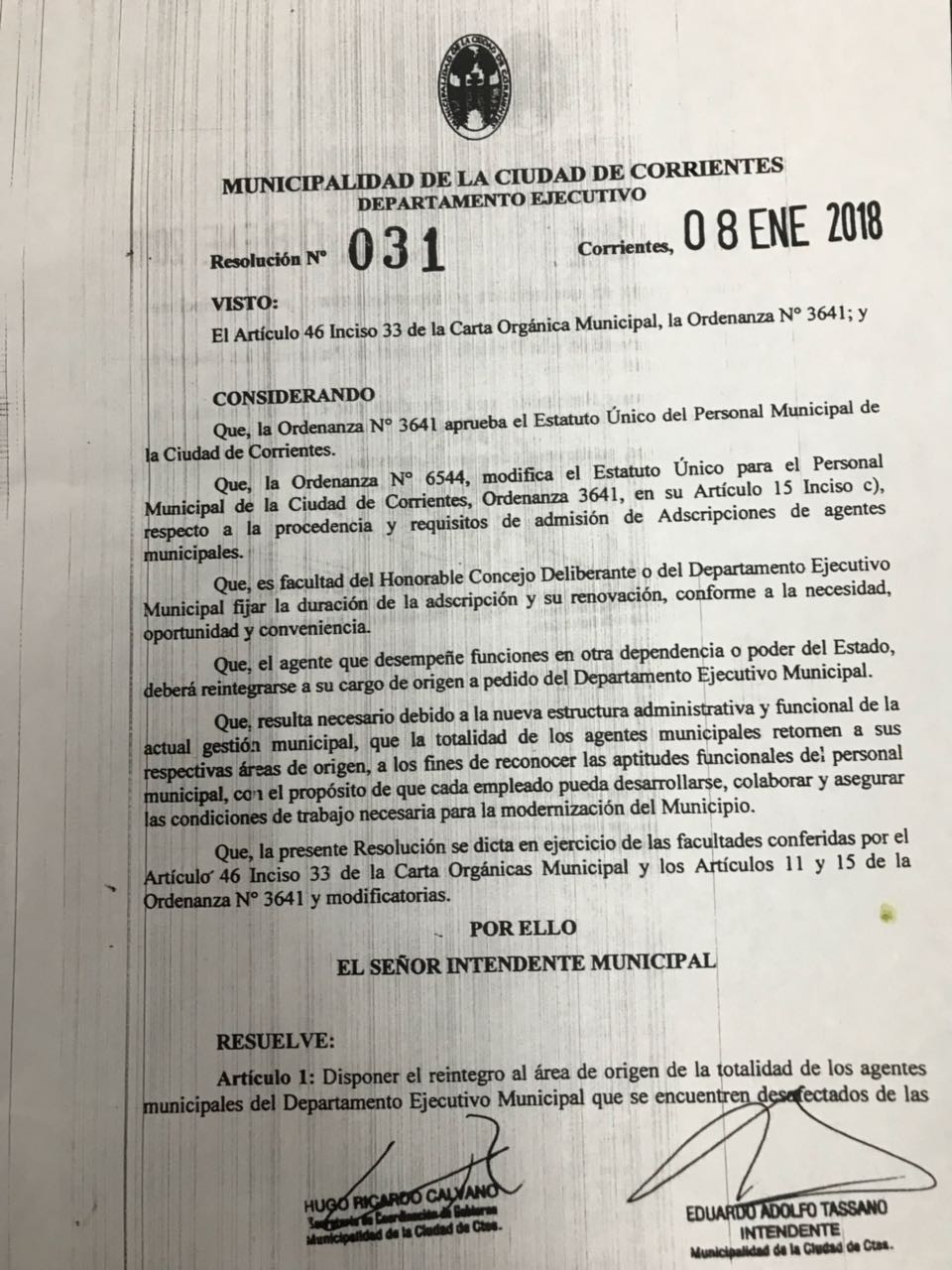 El personal de la Municipalidad de la Ciudad de Corrientes que figura adscripto a otra dependencia deberá inmediatamente presentarse a su lugar de origen.