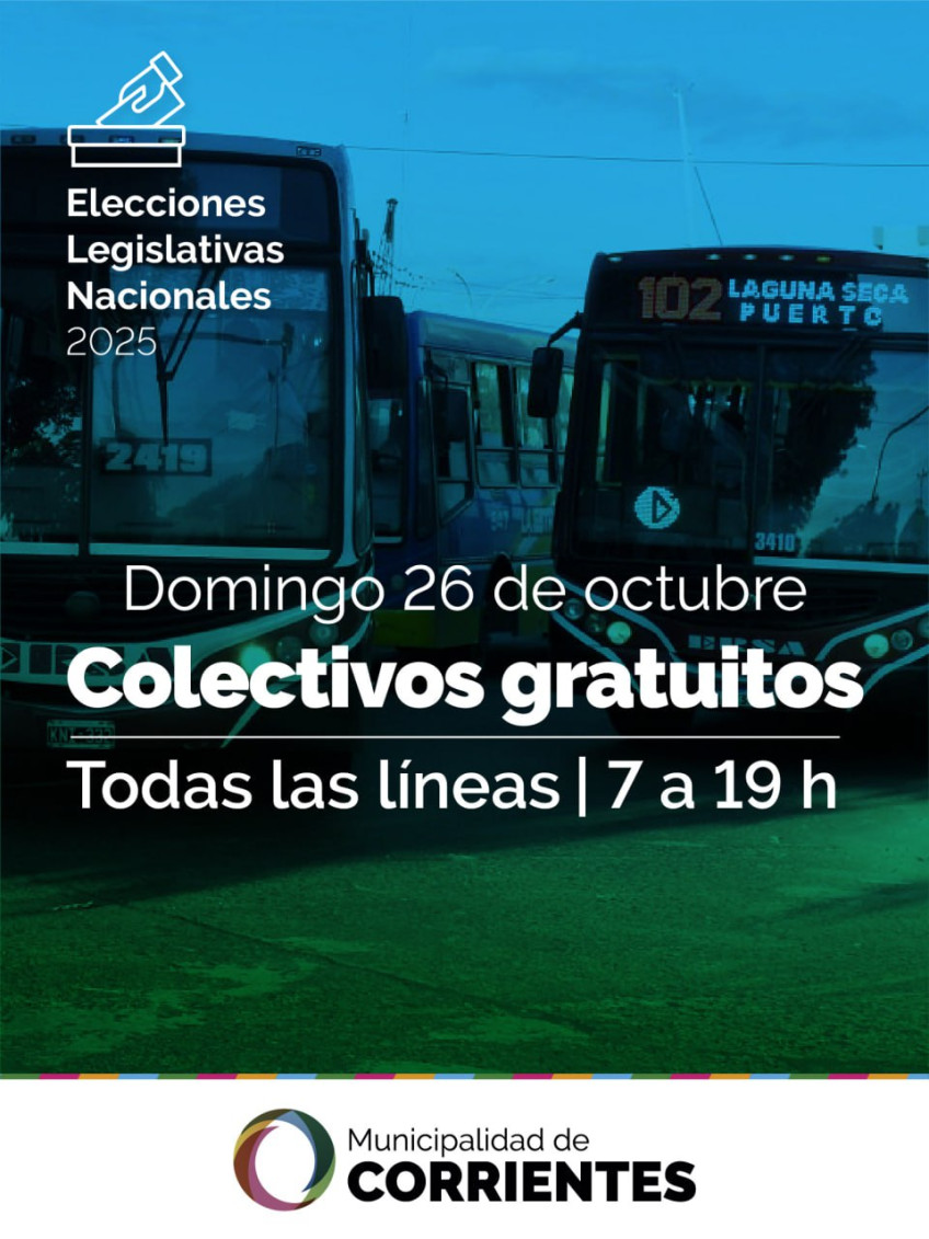 La Municipalidad de Corrientes informa que este domingo 26 de octubre el boleto del transporte urbano de pasajeros en el ámbito de la ciudad será gratuito, en el horario de 7 a 19, para que los vecinos puedan cumplir con su deber cívico.