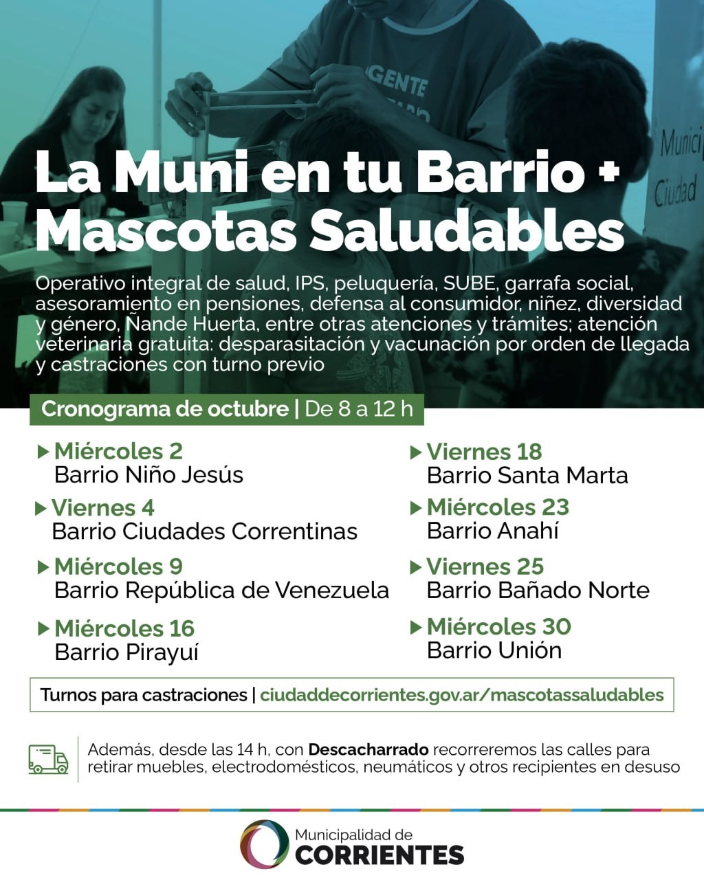 Las prestaciones sanitarias y servicios, más los programas Mascotas Saludables y Descacharrado comenzarán el miércoles venidero por la calle Ecuador y Pasaje Niño Jesús, y continuarán todo el mes en otros ocho barrios, los días miércoles y viernes, de 8 a 12.