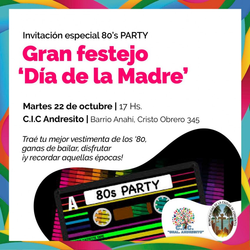 El martes 22, también a las 17 horas, los festejos se trasladarán al CIC Andresito del barrio Anahí, (Cristo Obrero 345). Esta celebración tendrá una temática especial ya que se llamará “80's Party”. Los concurrentes, en especial las mamis, están invitadas a concurrir con vestimentas y elementos relacionados con la década del 80. La fiesta estará ambientada con música relacionada con esos años, por lo que se estima una velada llena de color y alegría.