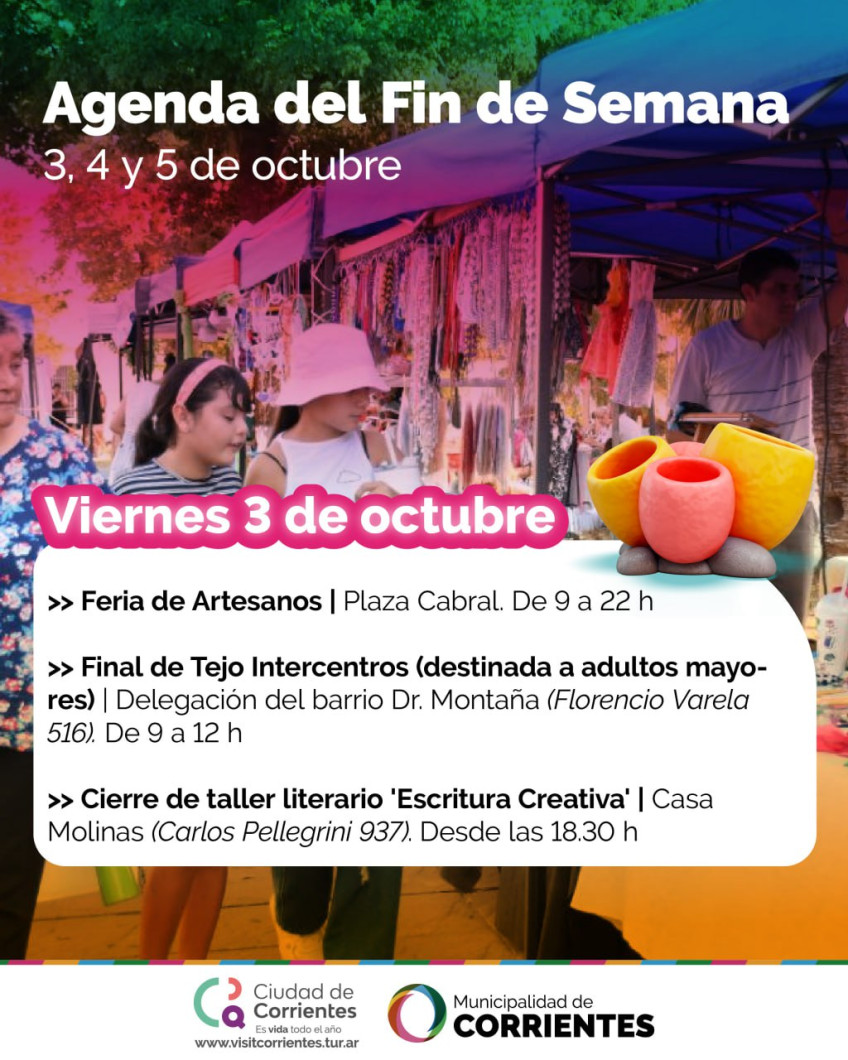 Desde el viernes y hasta el domingo, la Municipalidad de Corrientes preparó una agenda con diversas actividades al aire libre. Las propuestas que se desarrollarán en distintos espacios de la ciudad incluyen ferias, talleres literarios, visitas guiadas y muchas otras alternativas más.