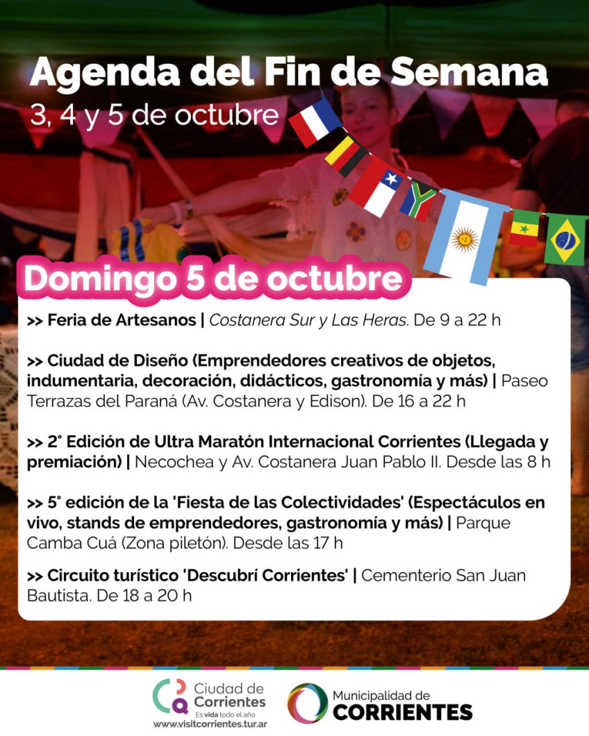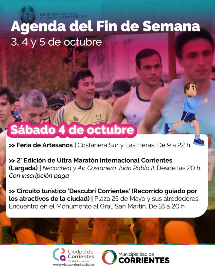 Este fin de semana, la Municipalidad de Corrientes propone un amplio abanico de ofertas culturales y de esparcimiento para vecinos y turistas. Entre las alternativas previstas habrá una maratón nocturna, ferias de emprendedores y de diseño, visitas pedestres guiadas, fiesta de colectividades y más opciones para el disfrute de grandes y chicos.