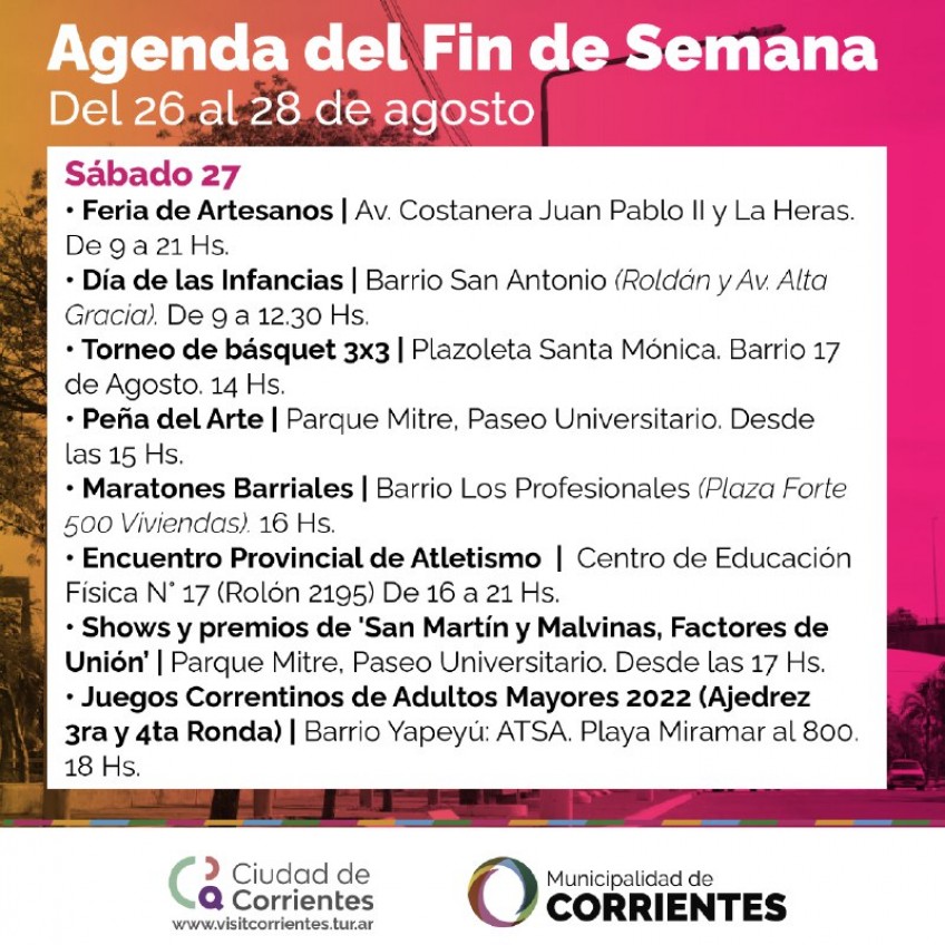 Una vez más, la Municipalidad de Corrientes ofrecerá un abanico de propuestas gratuitas para disfrutar este fin de semana en la ciudad. Habrá patio gastronómico, intervenciones artísticas, peña chamamecera, maratón barrial y festejos por el Día de la Niñez, entre otros atractivos.