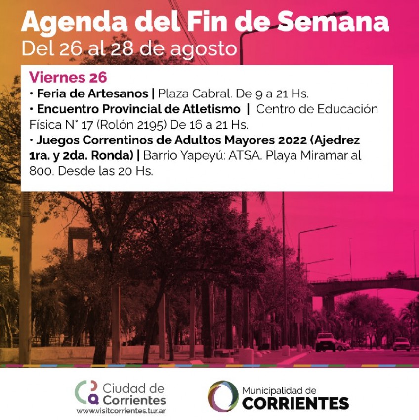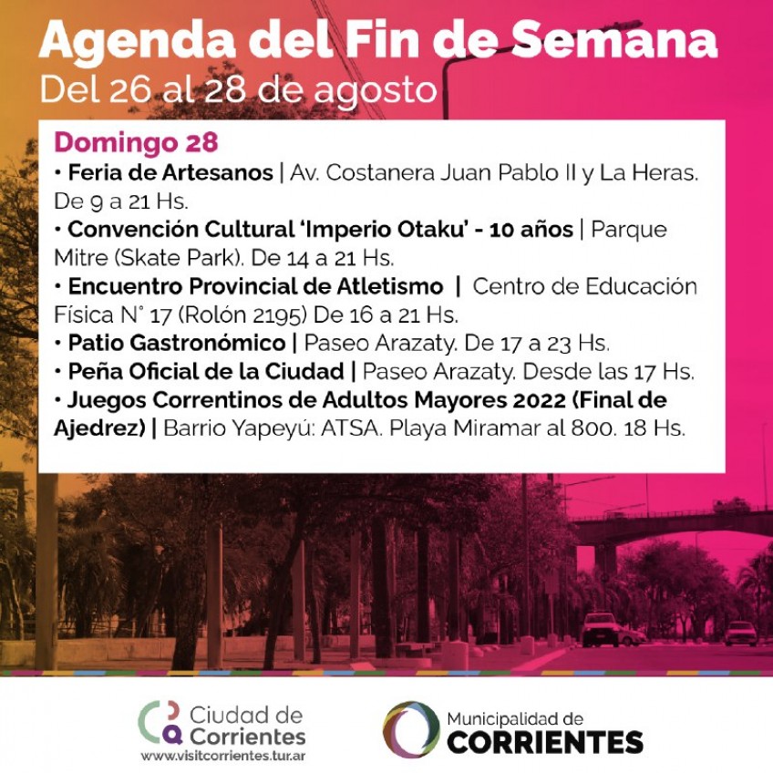 Desde el viernes hasta el domingo, la Municipalidad de la ciudad de Corrientes organizará una serie de eventos totalmente gratuitos para toda la familia en distintos espacios públicos de la capital.