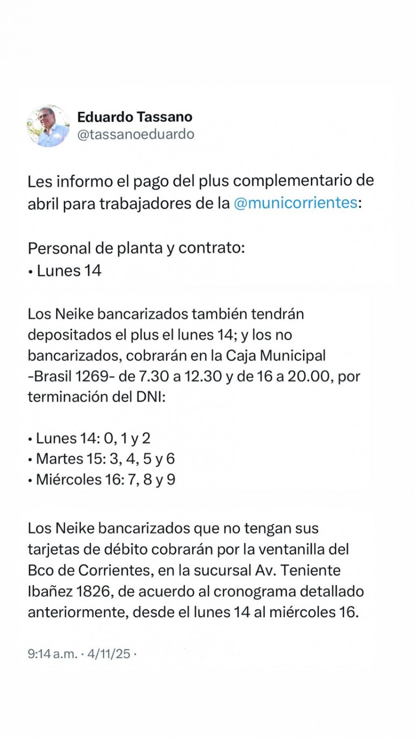 En tanto, los Neike bancarizados pero que no poseen tarjeta de débito, deberán cobrar por ventanilla del Banco de Corrientes (sucursal av. Teniente Ibáñez 1826) de acuerdo al cronograma detallado anteriormente.