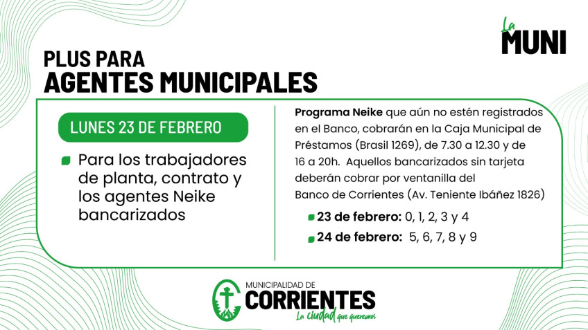 En tanto, los Neike bancarizados pero que aún no posean tarjeta de débito, deberán cobrar por ventanilla del Banco de Corrientes (sucursal av. Teniente Ibáñez 1826) de acuerdo al cronograma detallado anteriormente.