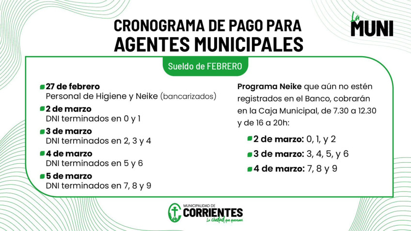 En tanto que los Neike bancarizados, pero que aún no tengan tarjetas de débito, podrán cobrar en la sucursal del Banco de Corrientes de av. Teniente Ibáñez 1826. Este segmento de trabajadores deberá regirse por el cronograma con terminación de DNI detallado anteriormente.