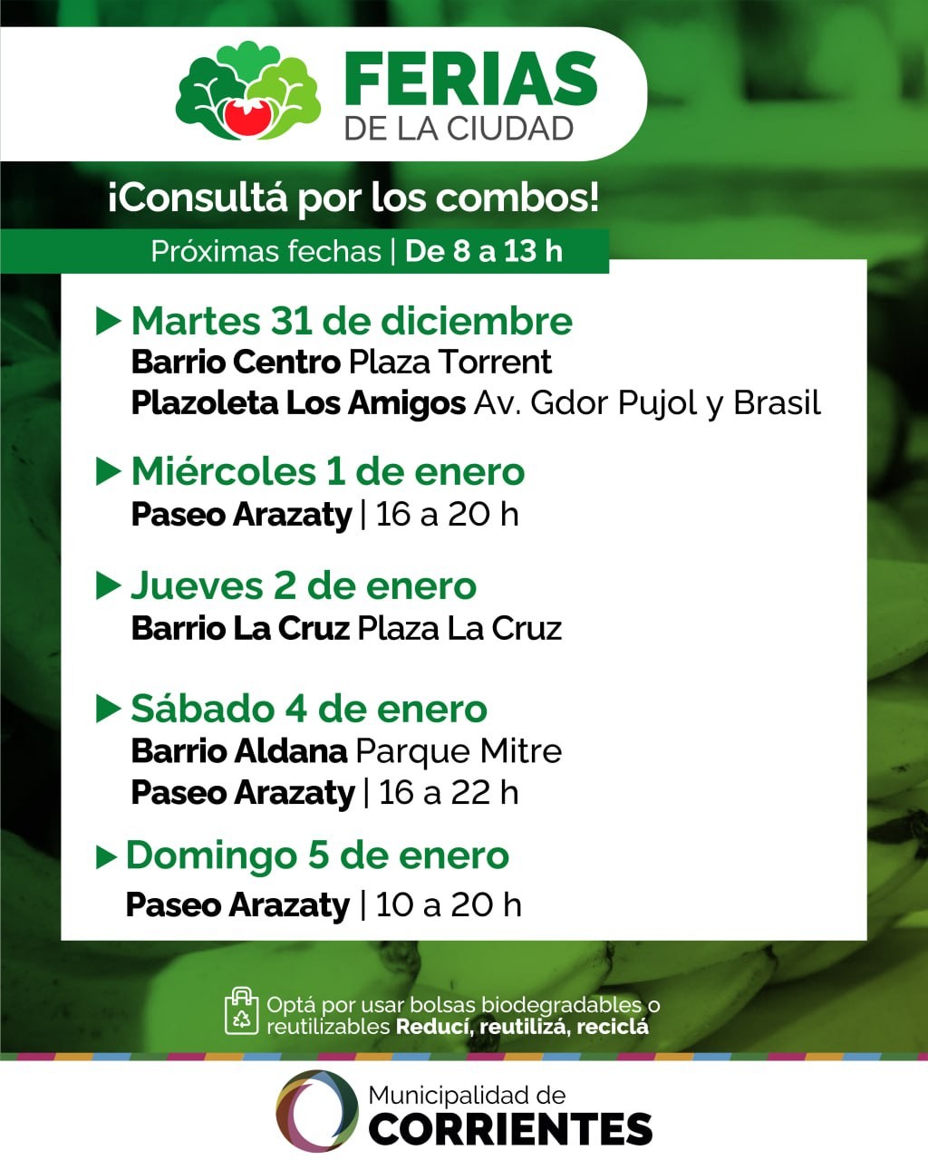 La Municipalidad de Corrientes informa el recorrido especial que tendrán las Ferias de la Ciudad el último día del año y en el inicio del 2025. La iniciativa es coordinada por la Secretaría de Desarrollo Económico Municipal, a través de la Subsecretaría de Economía Social de la Municipalidad de Corrientes.