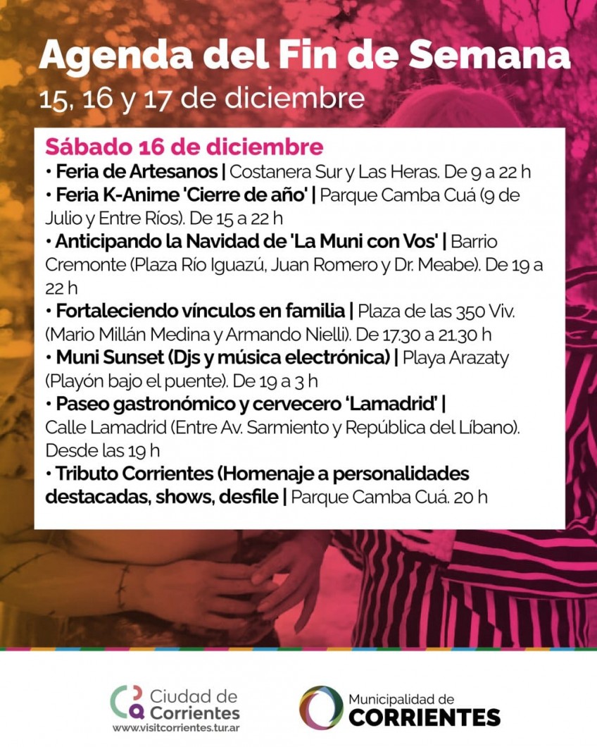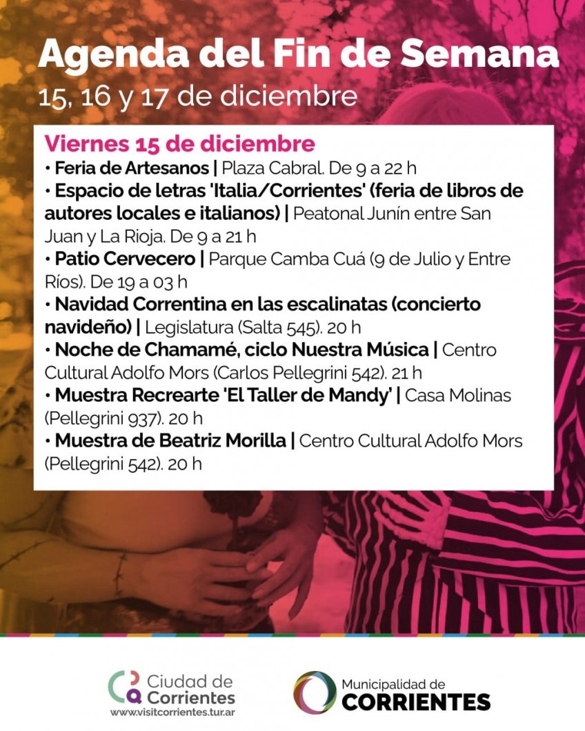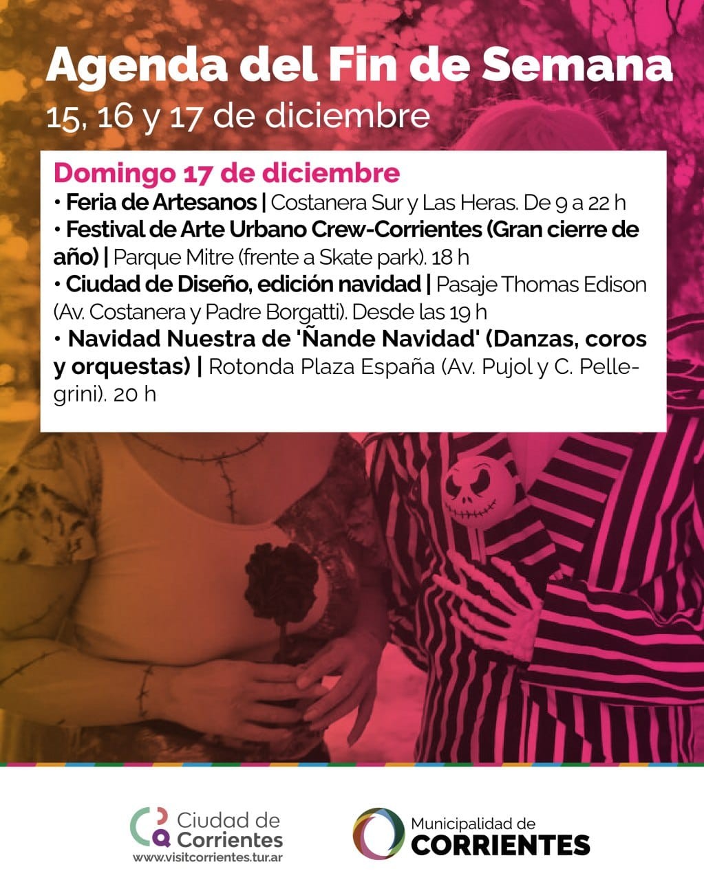 Como cada fin de semana, la Municipalidad de Corrientes prepara múltiples propuestas recreativas y culturales para el disfrute de vecinos y turistas. Encuentros navideños, musicales, de arte, forman parte de las alternativas que se desarrollarán de viernes a domingo, con acceso libre y gratuito, en diferentes puntos de la ciudad.