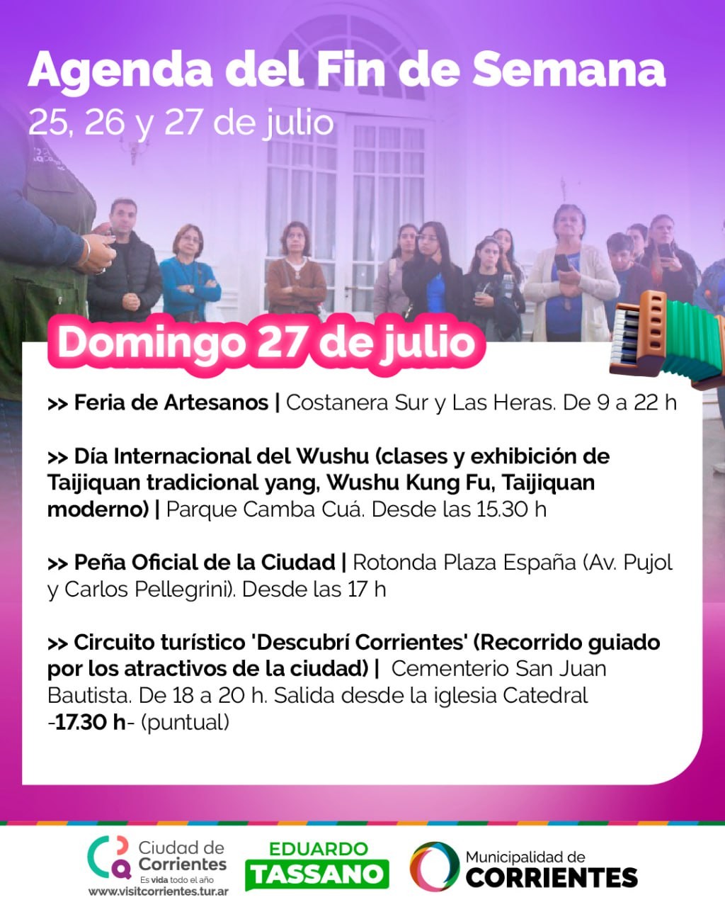 Se realizará, de 18 a 20, el habitual circuito turístico "Descubrí Corrientes", que tiene un recorrido guiado por los atractivos de la ciudad. En esta oportunidad será en la plaza 25 de Mayo y sus alrededores, con punto de encuentro en el Monumento al General San Martín.