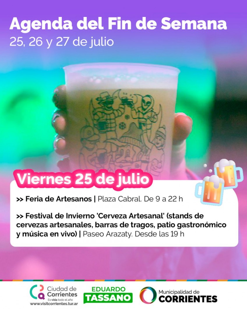 En esta segunda semana de vacaciones de invierno, vecinos y visitantes podrán disfrutar de las propuestas totalmente gratuitas organizadas por la Municipalidad de Corrientes. Entre ellas, el Festival de Invierno de Cerveza Artesanal en Paseo Arazaty, y las ya tradicionales, ferias, recorridos guiados y peñas.