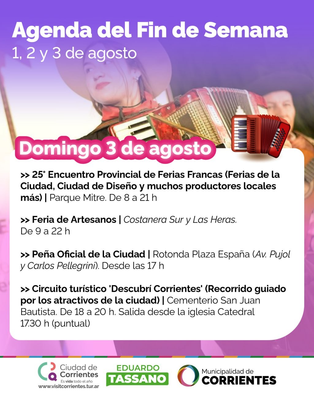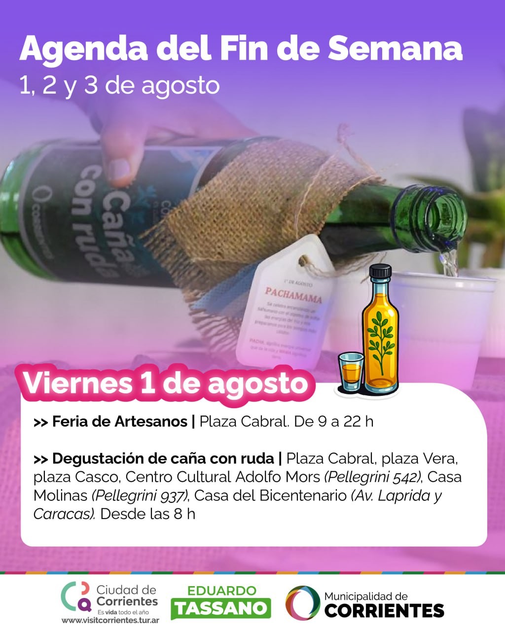 Como cada fin de semana, la Municipalidad de Corrientes ofrecerá de viernes a domingo un amplio abanico de propuestas culturales y recreativas para toda la familia. Entre ellas, habrá degustación de caña con ruda, ferias de productores, artesanos y emprendedores, visitas guiadas por la ciudad y la clásica Peña de la Ciudad.