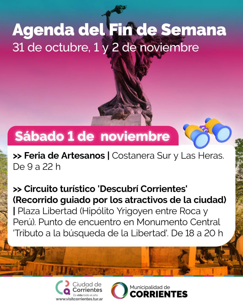 El sábado se realizará el habitual circuito turístico "Descubrí Corrientes" con un recorrido guiado por atractivos de la ciudad. En esta oportunidad será la segunda vez que se llevar adelante en la plaza Libertad (Hipólito Yrigoyen entre Roca y Perú), con el punto de encuentro en el Monumento Central “Tributo a la búsqueda de la Libertad”, en el horario de 18 a 20.
