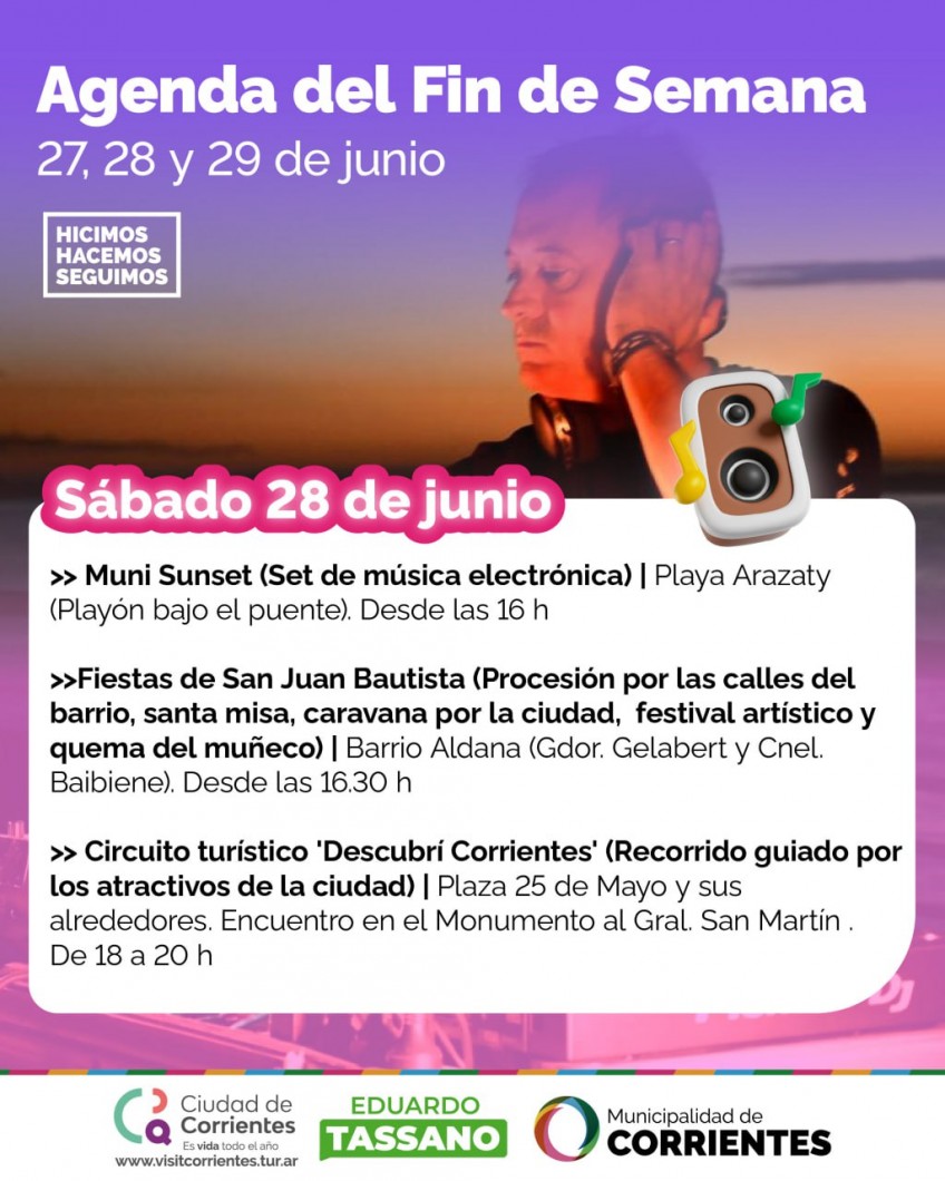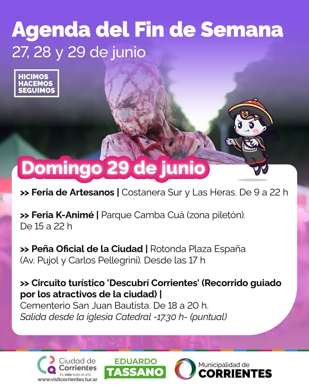 La Municipalidad de Corrientes organizó una variada agenda de actividades que se desarrollará desde el viernes al domingo. En diferentes espacios al aire libre se podrá disfrutar de la peña chamamecera, ferias de artesanos y emprendedores locales, maratón en el barrio Independencia, recorridos pedestres, entre otras propuestas para vecinos y visitantes. Al realizarse en espacios al aire libre, están sujetas a las inclemencias del tiempo.