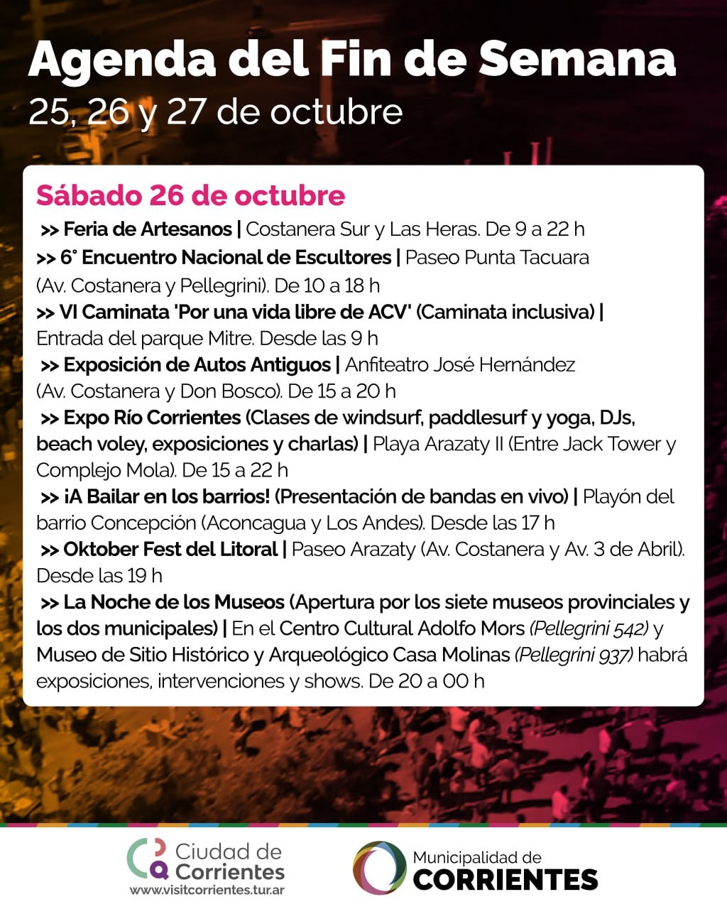 La Municipalidad de Corrientes pone a disposición de vecinos y visitantes una amplia agenda de actividades para disfrutar al aire libre. Las alternativas totalmente gratuitas, incluyen feria de autos clásicos, Oktober Fest del Litoral, la Noche de los Museos, encuentro de escultores, peña, maratón, y mucho más.
