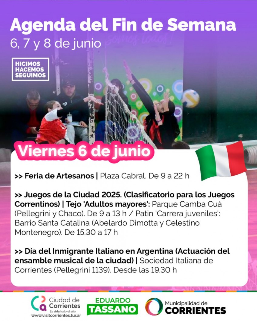 El primer fin de semana de junio llega con una amplia oferta de actividades para vecinos y visitantes. Como es costumbre, la Municipalidad de Corrientes organizó una variada agenda que se desarrollará desde el viernes al domingo. En diferentes espacios al aire libre, se podrá disfrutar de recorridos guiados, ferias, actividades deportivas y homenaje a la colectividad italiana, entre muchas otras alternativas.