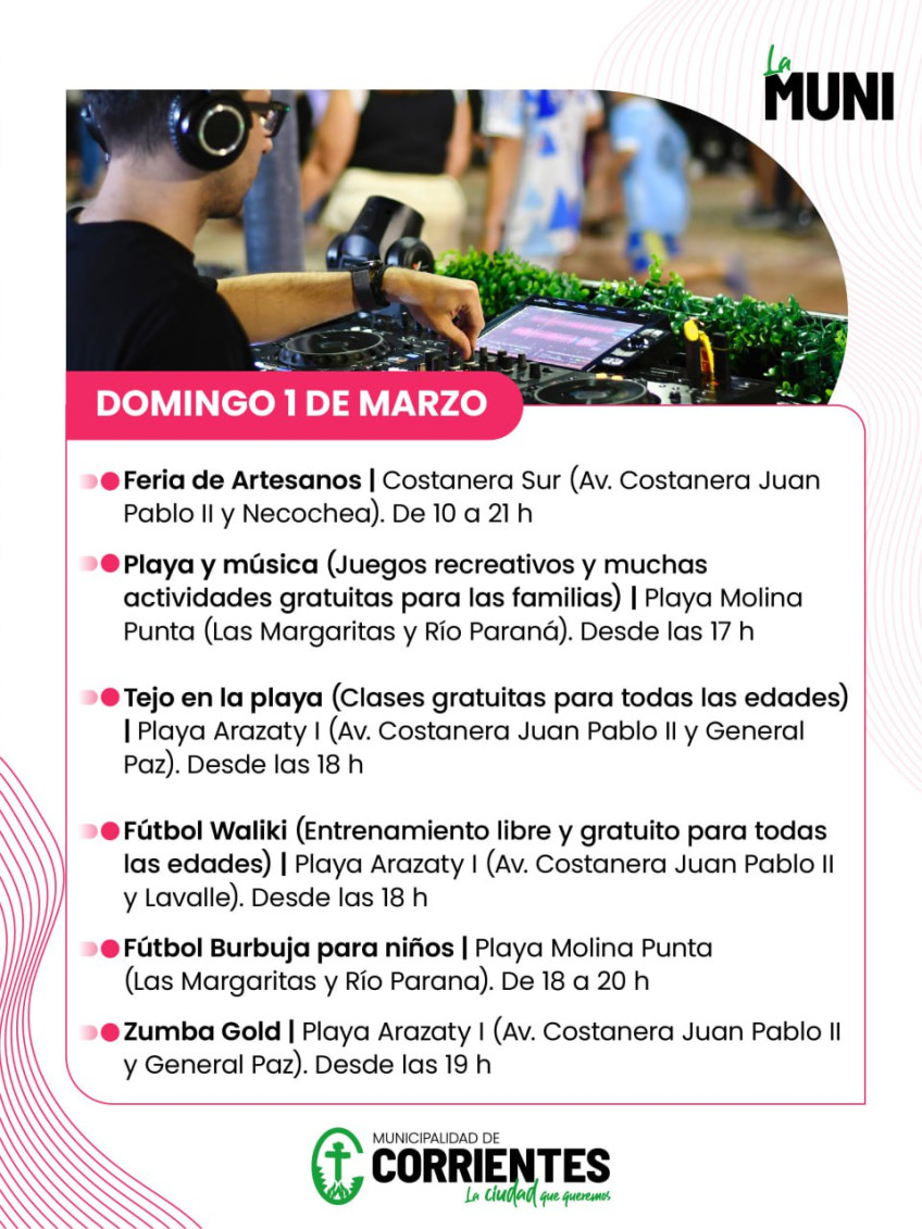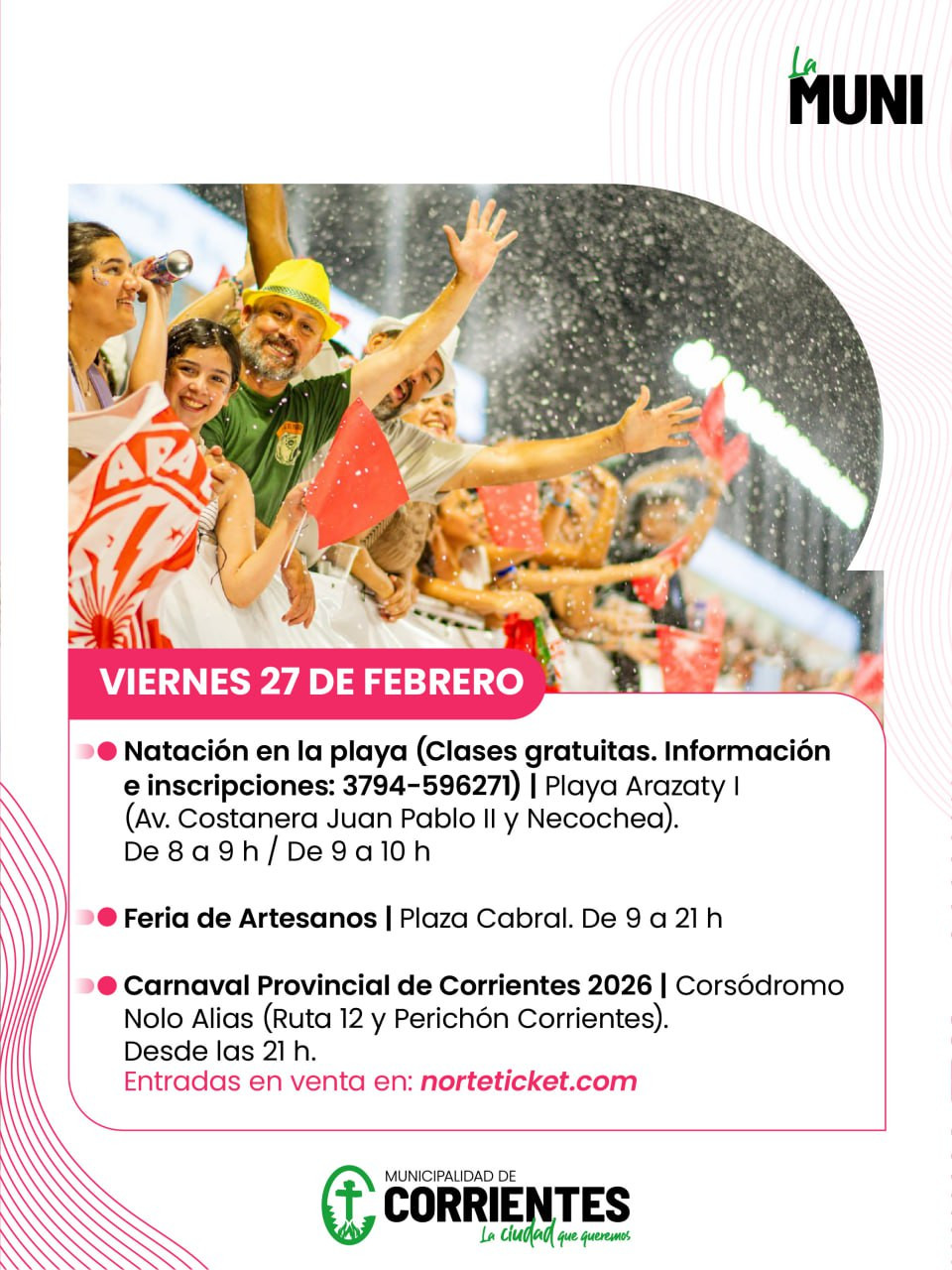 La Municipalidad de Corrientes dio a conocer una intensa agenda de actividades culturales, recreativas, deportivas y turísticas para el último fin de semana de febrero y el inicio de marzo, con muchas propuestas gratuitas y abiertas al público en playas, plazas y espacios emblemáticos de la ciudad, destinadas tanto a vecinos como a visitantes.