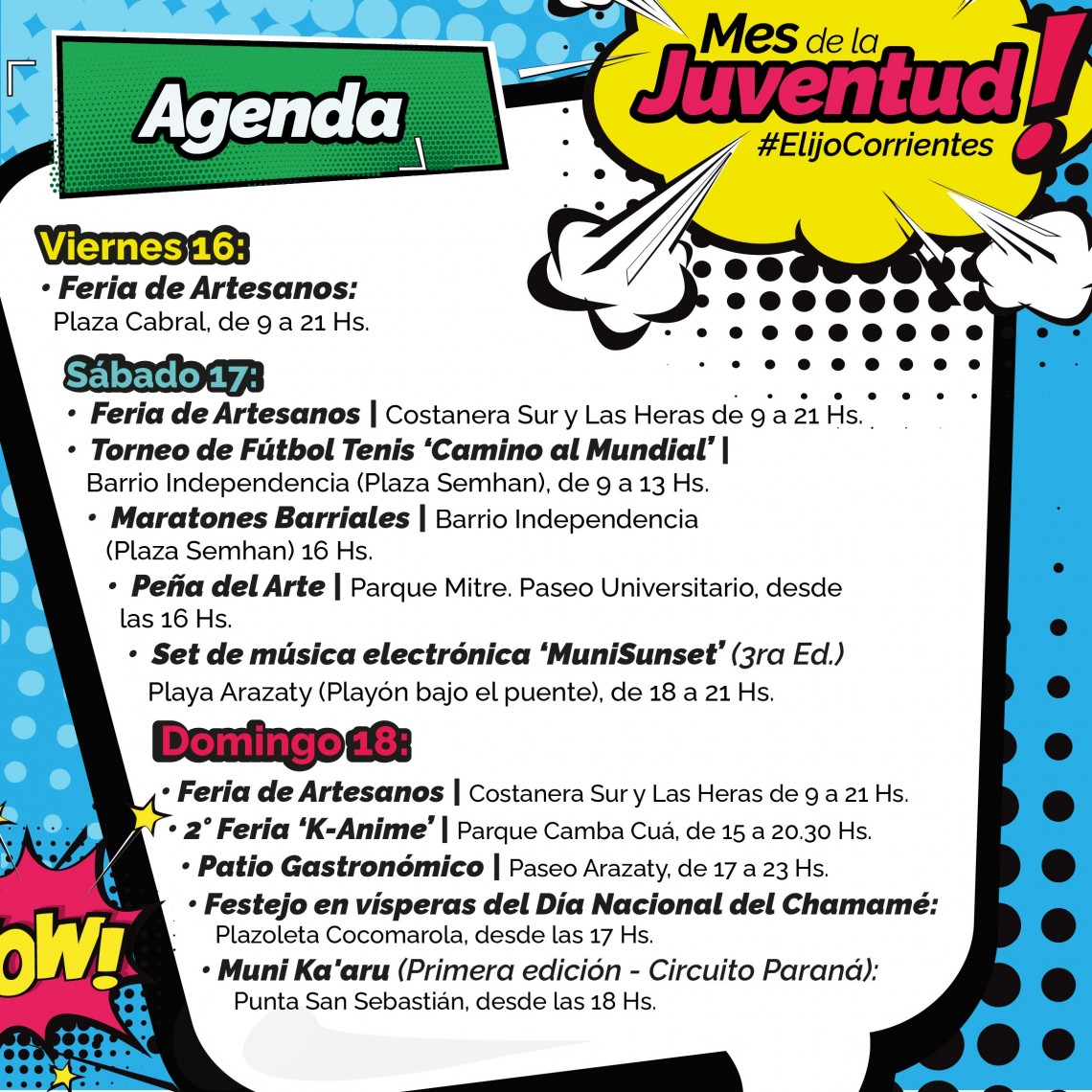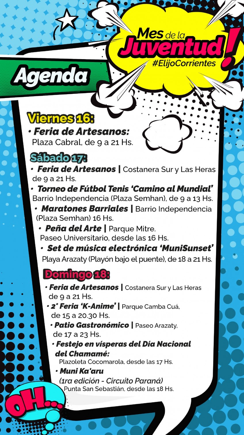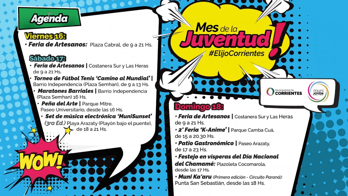 La Municipalidad continúa ofreciendo una gran agenda de eventos abiertos y gratuitos para este fin de semana en el marco del Mes de la Juventud y para toda la familia. Habrá Feria K-Animé, atardecer con música electrónica, maratones barriales y fútbol tenis, entre otros. En vísperas del Día Nacional del Chamamé, se realizará un gran espectáculo en la plazoleta Cocomarola.