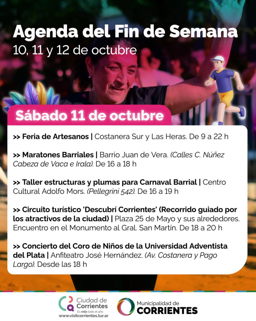 De cara a un fin de semana largo, por el feriado nacional por el Día del Respeto a la Diversidad Cultural, la Municipalidad de Corrientes propone un amplio abanico de ofertas culturales y de esparcimiento para vecinos y turistas. Entre las alternativas previstas habrá freestyle, una nueva edición de maratones barriales, ferias de emprendedores, visitas pedestres guiadas, peña y más opciones para el disfrute de grandes y chicos.