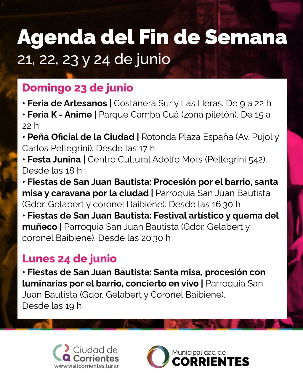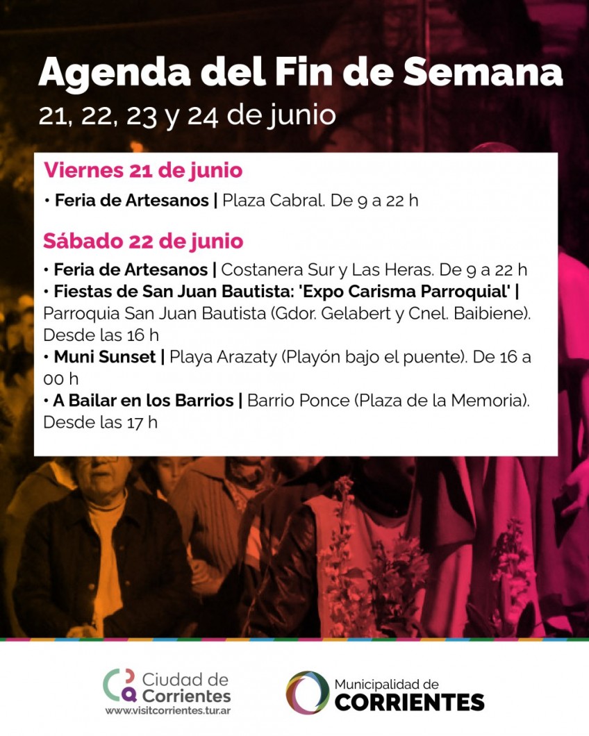 Consolidándose la capital correntina como una ciudad de eventos, la Municipalidad de Corrientes prepara para este fin de semana largo un abanico de entretenimientos para disfrutar en familia y con amigos. Durante estos días, habrá propuestas musicales, feria k-animé, además de festejos patronales en honor a San Juan Bautista.