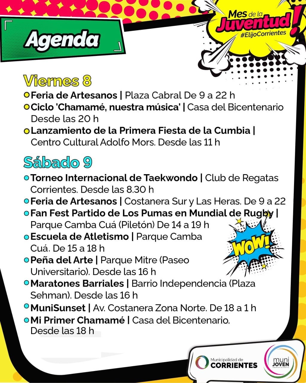 Como cada fin de semana, la Municipalidad de Corrientes pone a disposición una serie de eventos gratuitos para grandes y chicos. Desde el viernes y hasta el domingo en distintos puntos de la ciudad habrá ferias de artesanos, peñas, deporte, danza, como así también se podrá alentar en pantalla gigante a Los Pumas en el inicio del Mundial de Rugby.