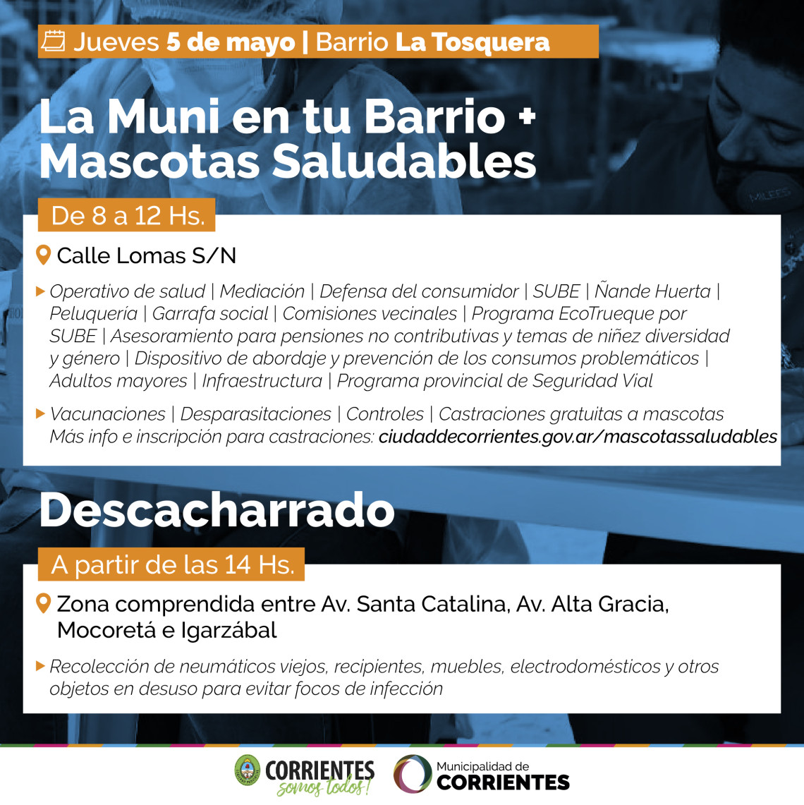 Desde el área de Coordinación Territorial, adelantaron que el próximo operativo de La Muni En Tu Barrio y Mascotas Saludables será el jueves 5 de mayo, de 8 a 12, en el barrio La Tosquera, en un predio ubicado en el tramo final de calle Lomas; mientras que el operativo de descacharrado será en ese mismo barrio, desde las 14, en la zona comprendida entre avenida Santa Catalina, Mocoretá, Alta Gracia e Igarzábal.