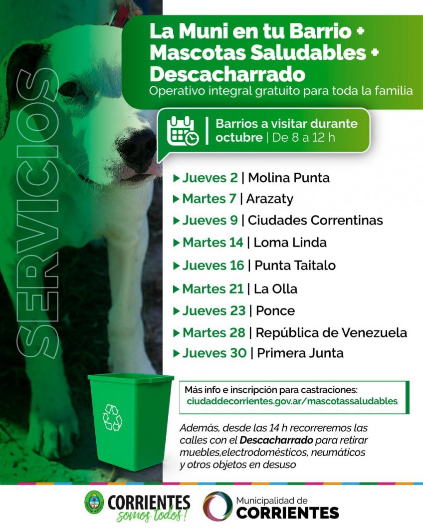 En cada operativo, La Muni en tu Barrio estará acompañado del programa Mascotas Saludables, que promueve la tenencia responsable de los animales domésticos, acercando atención veterinaria gratuita, vacunación antirrábica, desparasitaciones y esterilizaciones (castraciones). Este último servicio debe requerirse con antelación a través del turnero web (https://ciudaddecorrientes.