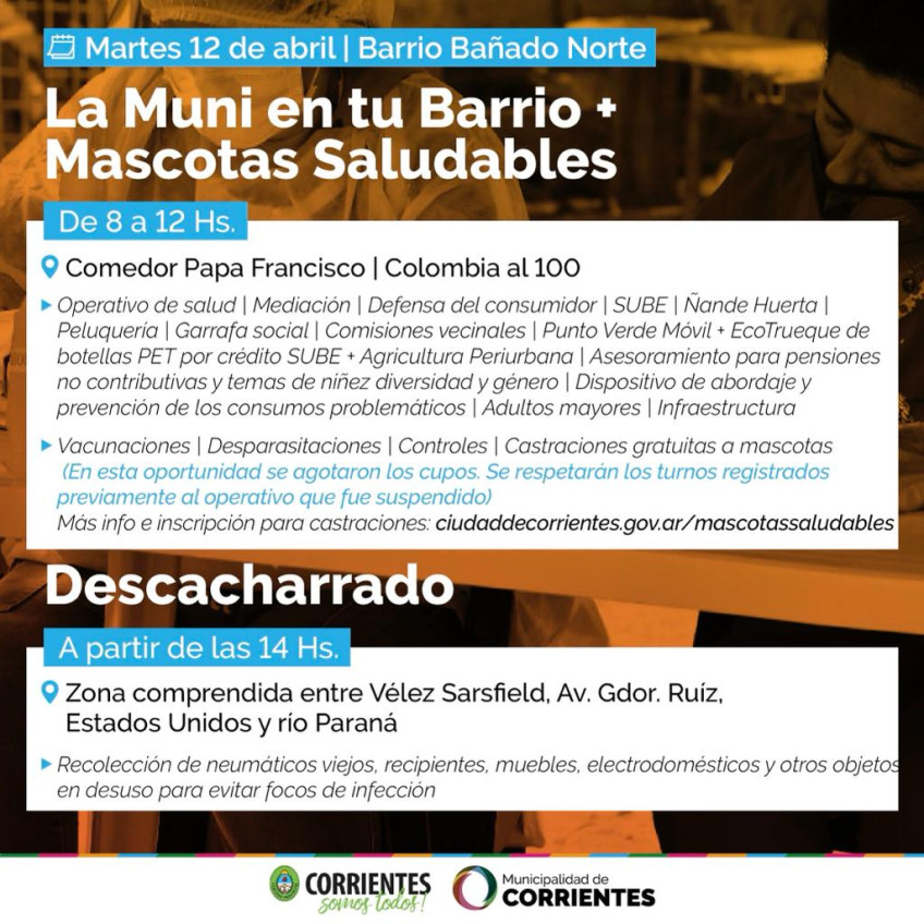 Durante la próxima semana, los operativos de servicios municipales gratuitos para los vecinos de la ciudad llegará únicamente al barrio Bañado Norte, el martes 12, dado que el jueves 14 será feriado por Semana Santa.