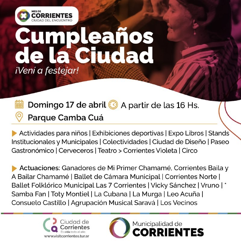 La Municipalidad de Corrientes invita a vecinos y turistas que nos visitan a celebrar juntos el “Cumpleaños de la Ciudad”, a través un gran festival artístico y cultural que se llevará adelante este domingo desde las 16 en el parque Cambá Cuá. Se trata de la reprogramación del evento de apertura del “Mes de Corrientes” que había sido suspendido el pasado 3 de abril por las condiciones del tiempo.