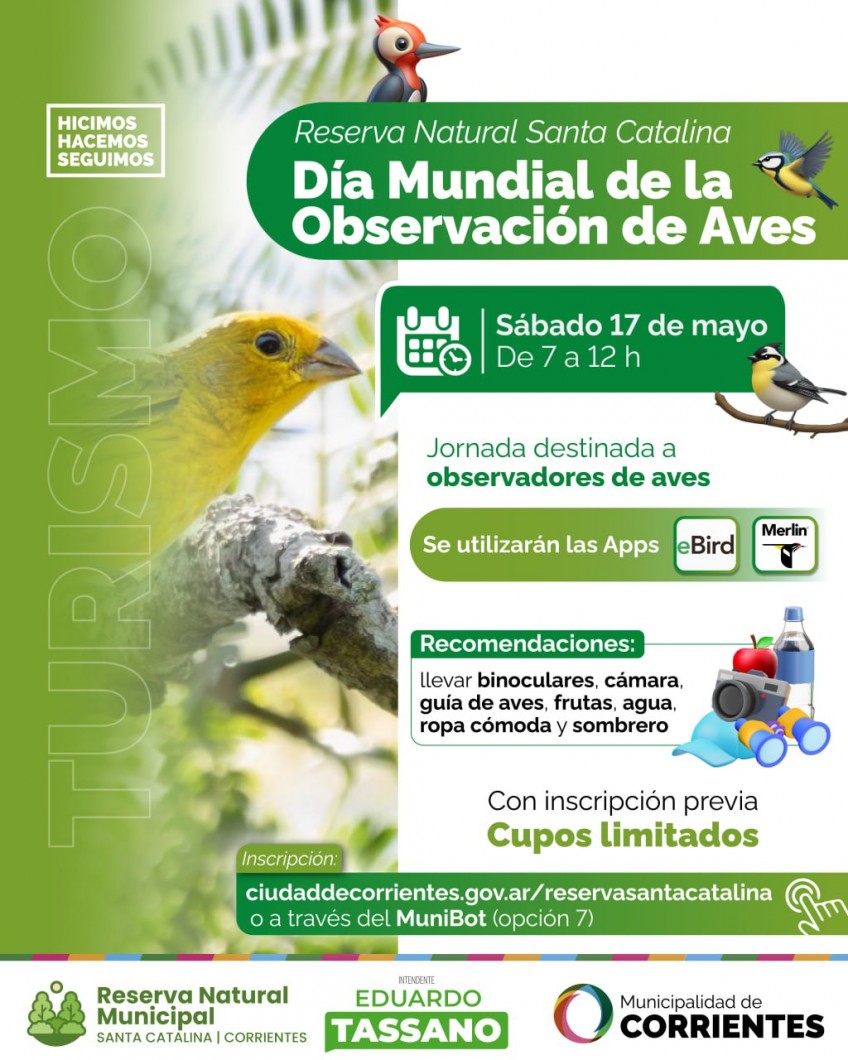 Este sábado 17 de mayo en la Reserva Natural Municipal Santa Catalina se realizará una jornada de avistaje de aves, con acceso gratuito y el acompañamiento de guías. Los vecinos interesados solamente deberán inscribirse a través del siguiente link: ciudaddecorrientes.gov.