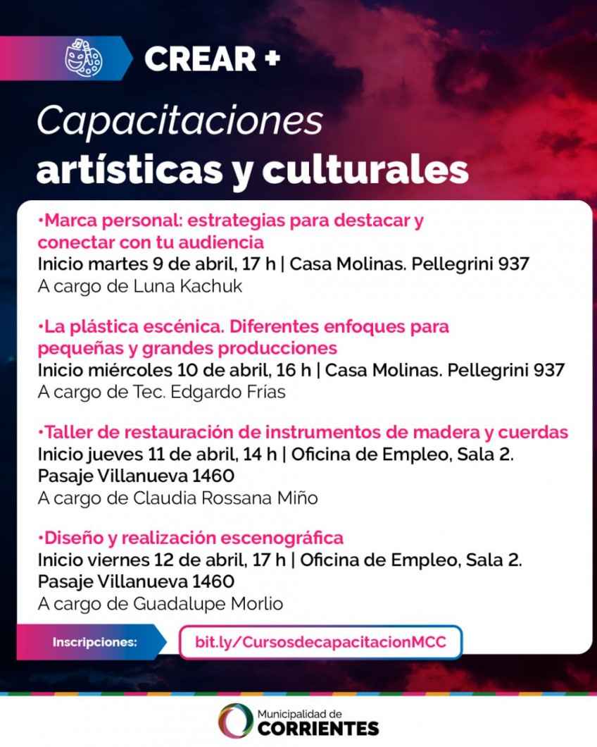 La Municipalidad de Corrientes, a través de la Secretaría de Cultura y Educación, pondrá en marcha a partir del mes de abril, distintos cursos gratuitos de capacitación dirigidos a artistas y trabajadores de la cultura en general, que se dictarán en el marco del programa Crear + 2024.