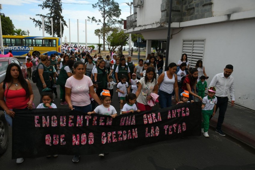 En el marco del Día Internacional de la Lucha contra el Cáncer de Mama, los niños de los CDI y los adultos mayores caminaron este miércoles desde el puerto hasta la plaza 25 de Mayo, donde fueron recibidos por la Banda de Música de la Policía.