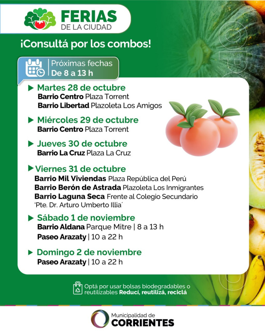 Los feriantes se presentarán entre el martes 28 de octubre y el domingo 2 de noviembre en diferentes espacios verdes y recreativos de la capital. Como lo vienen haciendo a lo largo del año, comercializarán productos de calidad y a precios convenientes, en esta ocasión priorizando aquellos de la nueva temporada.