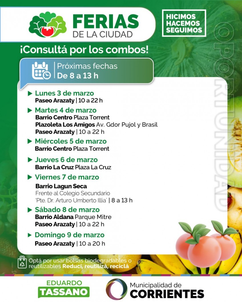 La Municipalidad de Corrientes continúa acercando productos de calidad y combos a precios convenientes a los vecinos de la capital, a través de las Ferias de la Ciudad. Esta propuesta es coordinada por la Secretaría de Desarrollo Económico municipal, a través de la Subsecretaría de Economía Social.