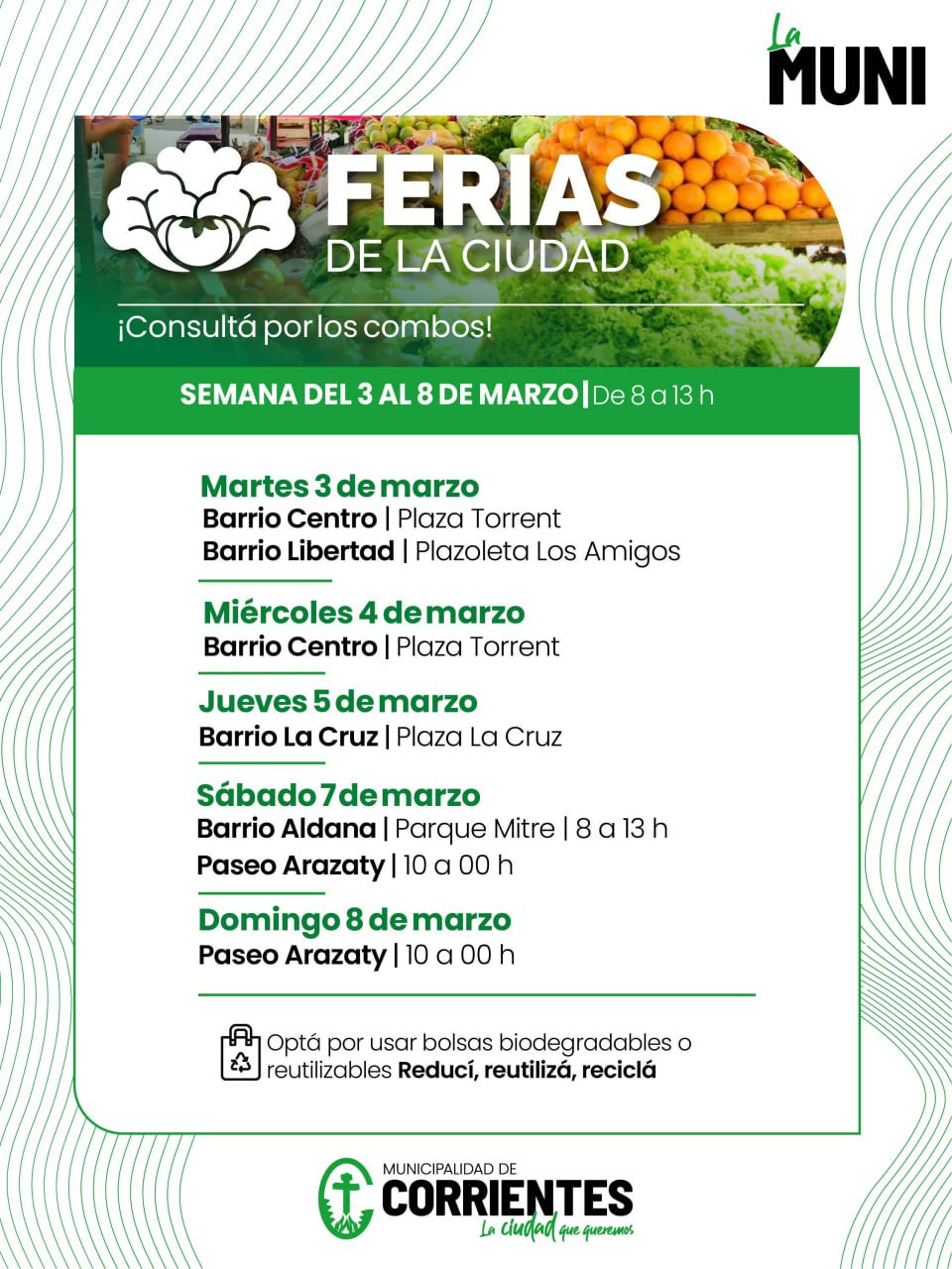 Entre el martes 3 y el domingo 8 de marzo, las ferias itinerantes organizadas por la Municipalidad de Corrientes realizarán su habitual recorrido por espacios públicos de la ciudad, con su oferta de productos de calidad y mejores precios. Los vecinos podrán adquirir frutas y verduras, productos manufacturados, artesanías, plantas ornamentales, entre otras propuestas.