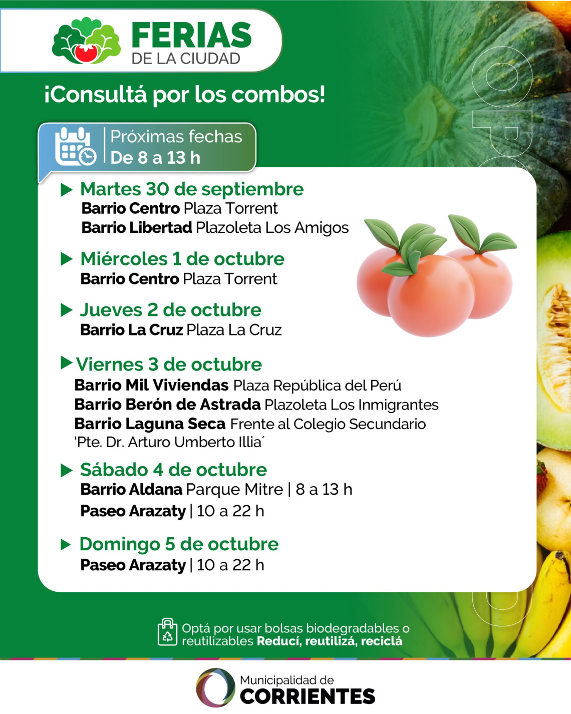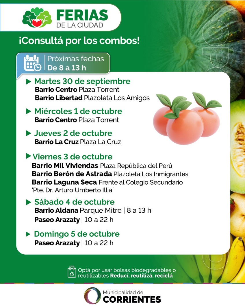 Impulsadas por la Municipalidad de Corrientes, las ferias itinerantes inician otro mes de actividad plena con renovadas ofertas para satisfacer la creciente demanda de vecinos en todos los barrios. Los puesteros estarán desde el martes 30 de septiembre hasta el domingo 5 de octubre en plazas y plazoletas con frutas, verduras, plantas ornamentales y artesanías, entre otros productos.