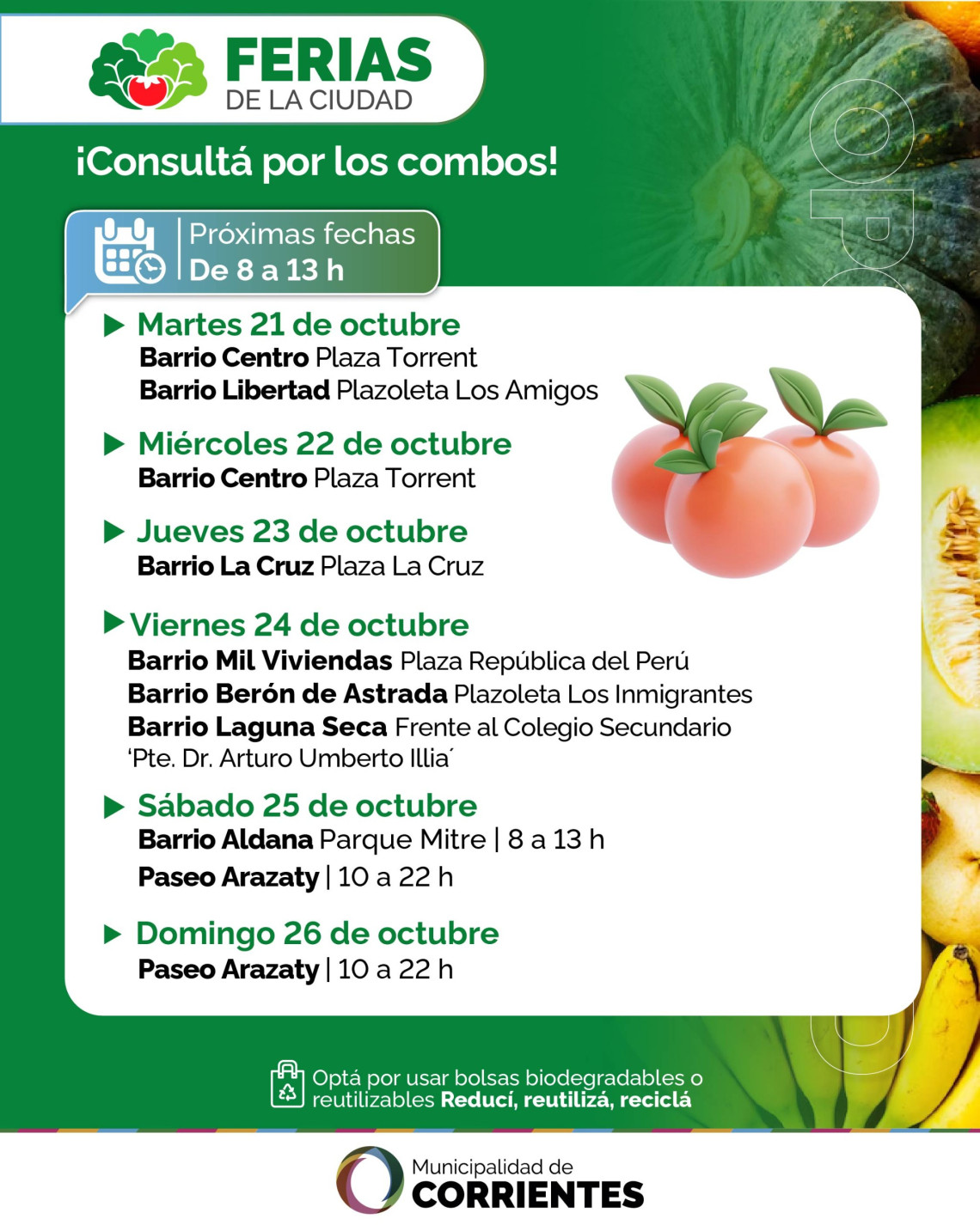 El jueves 23 de octubre los feriantes se presentarán en la plaza La Cruz, mientras que el viernes 24 estarán simultáneamente en la plaza Los Inmigrantes del Berón de Astrada (Av. Sarmiento y Av. Correa Fernández); la plaza República del Perú de las Mil Viviendas (Av. Patagonia entre Av. La Paz y Av. Paysandú) y el campo de juego ubicado frente al colegio secundario Arturo Illia del barrio Laguna Seca (Larrea al 3400).