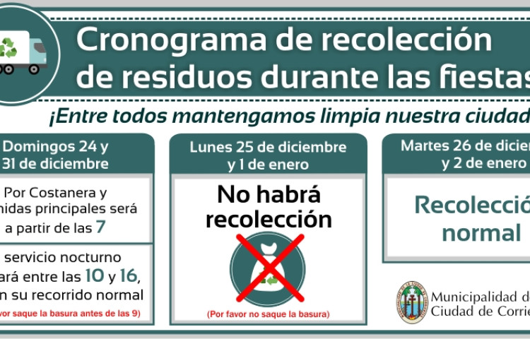 En materia de recolección de residuos, el 24 y 31 de diciembre el servicio durante la mañana iniciará a las 7 por Costanera y avenidas principales de la Ciudad; mientras que el nocturno