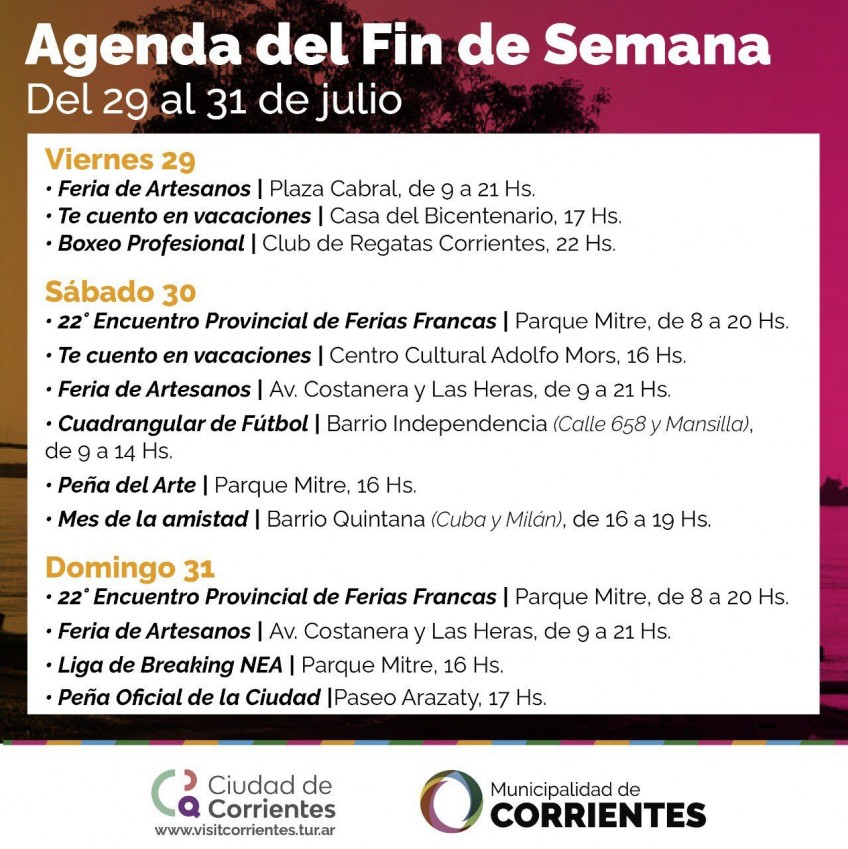 La ciudad de Corrientes se prepara con múltiples actividades para el cierre del receso invernal. Desde hoy y hasta el domingo 31, el mes de julio cerrará con una variada oferta para vecinos y turistas. Habrá música, deportes y eventos culturales. El Parque Mitre será sede del 22° Encuentro Provincial de Ferias Francas.